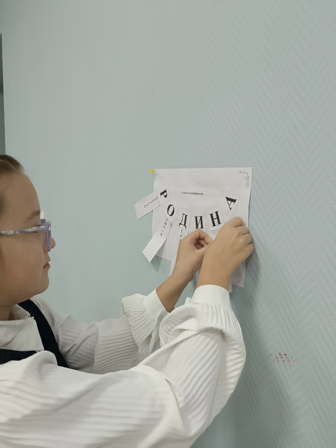 Затем ребята приняли участие в конкурсных заданиях. В задании «Кроссворд» – по шести вопросам собрали ключевое слово по вертикали, которое являлось основной темой часа, слово Родина. Подобрали однокоренные слова к слову Родина, высказали свои мысли, что для них значит Родина.