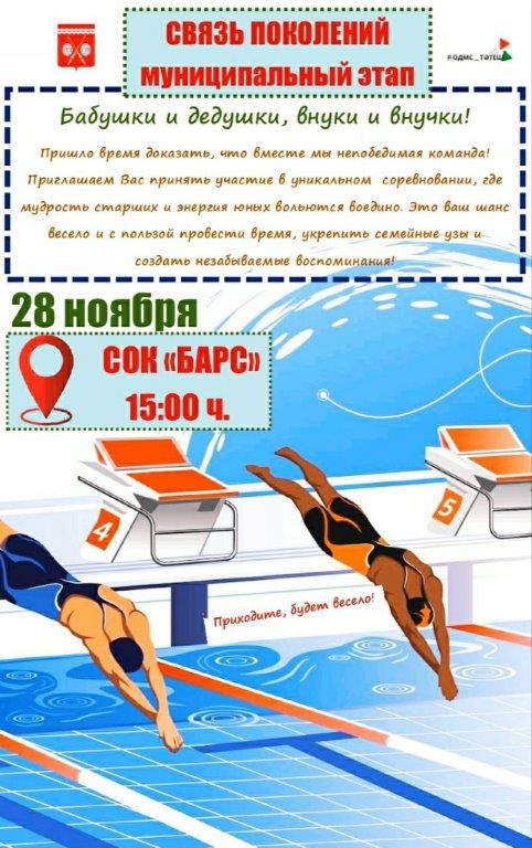 Приглашаем всех на муниципальный этап Республиканских соревнований по плаванию "Связь поколений", где вместе будут соревноваться бабушки, дедушки и их внуки.