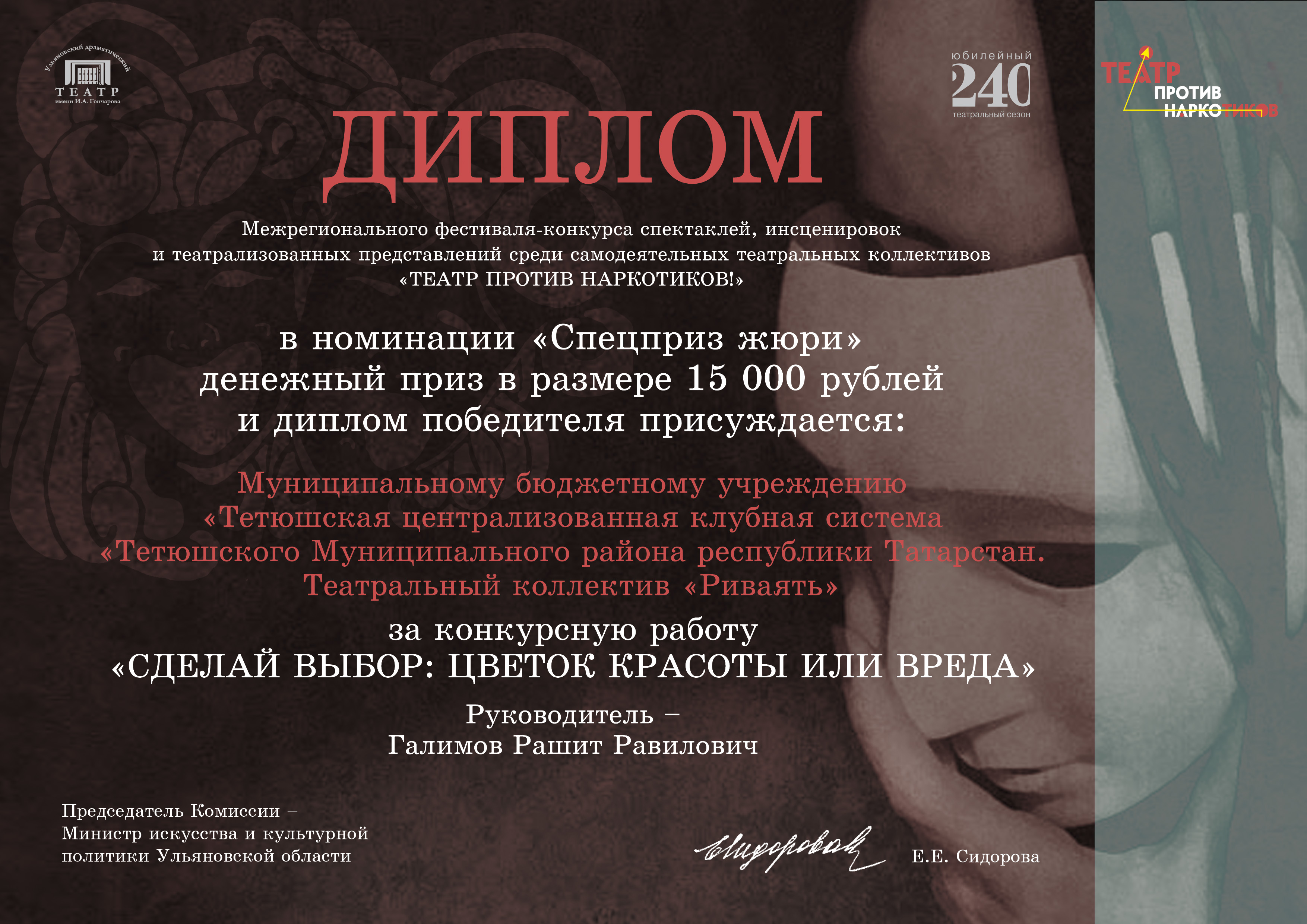 Детско-подростковый театральный коллектив “Риваять” Кляшевского Дома культуры принял участие в фестиваль-конкурсе спектаклей, инсценировок и театрализованных представлений среди самодеятельных театральных коллективов «ТЕАТР ПРОТИВ НАРКОТИКОВ!», направленный на профилактику наркомании среди детей и подростков средствами социальных спектаклей и театрализованных представлений с постановкой театрализованного представления «Сделай выбор: цветок красоты или вреда».