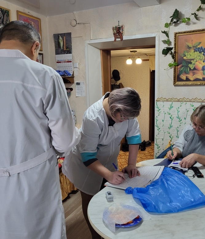 Специалисты отделения надомного обслуживания КЦСОН «Тетюшское сияние» совместно с врачом-гериатром Салаховым Фирдусом Рифкатовичем и медицинской сестрой ГАУЗ «Тетюшская ЦРБ» посетили получателей социальных услуг на дому по программе Система долговременного ухода (СДУ), с целью проведения медицинской диагностики и оценки риска развития осложнений, связанных с основными и сопутствующими заболеваниями.