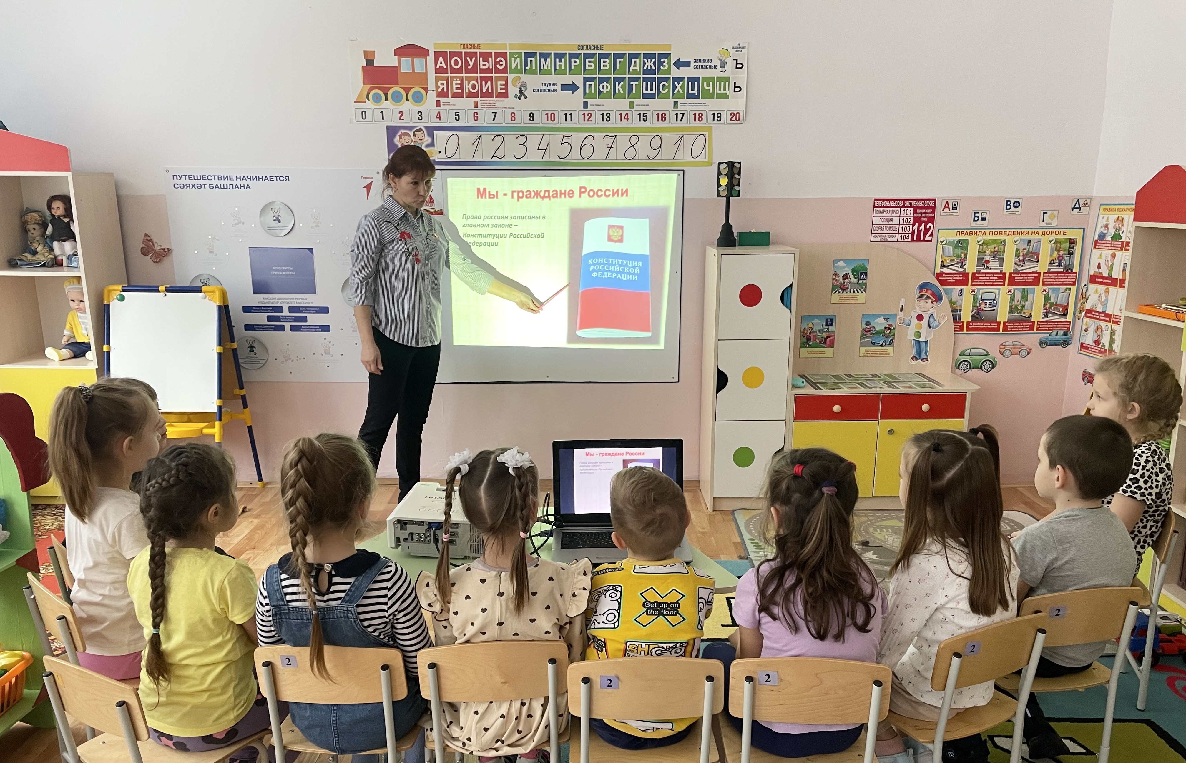 В этот знаменательный для страны день воспитанники детского сада «Малыш» посмотрели презентацию на тему "Конституция - основной закон страны", в ходе которой ознакомились с понятиями «закон», «порядок», «право», повторили государственную символику: флаг, герб. Также дети закрепили знания о своих правах в нашей стране.