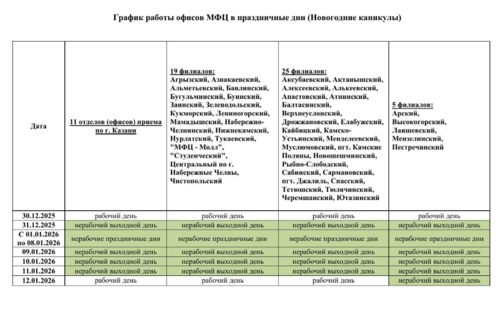 В связи с тем, что в соответствии со статьей 112 ТК РФ 1,2,3,4,5,6 и 8 января - Новогодние каникулы, 7 января - Рождество Христово являются нерабочими праздничными днями в Республике Татарстан, государственное бюджетное учреждение «Многофункциональный центр предоставления государственных и муниципальных услуг в Республике Татарстан» (далее - ГБУ МФЦ) предоставляет график работы отделов/филиалов ГБУ МФЦ в предпраздничные, выходные и праздничные дни.
