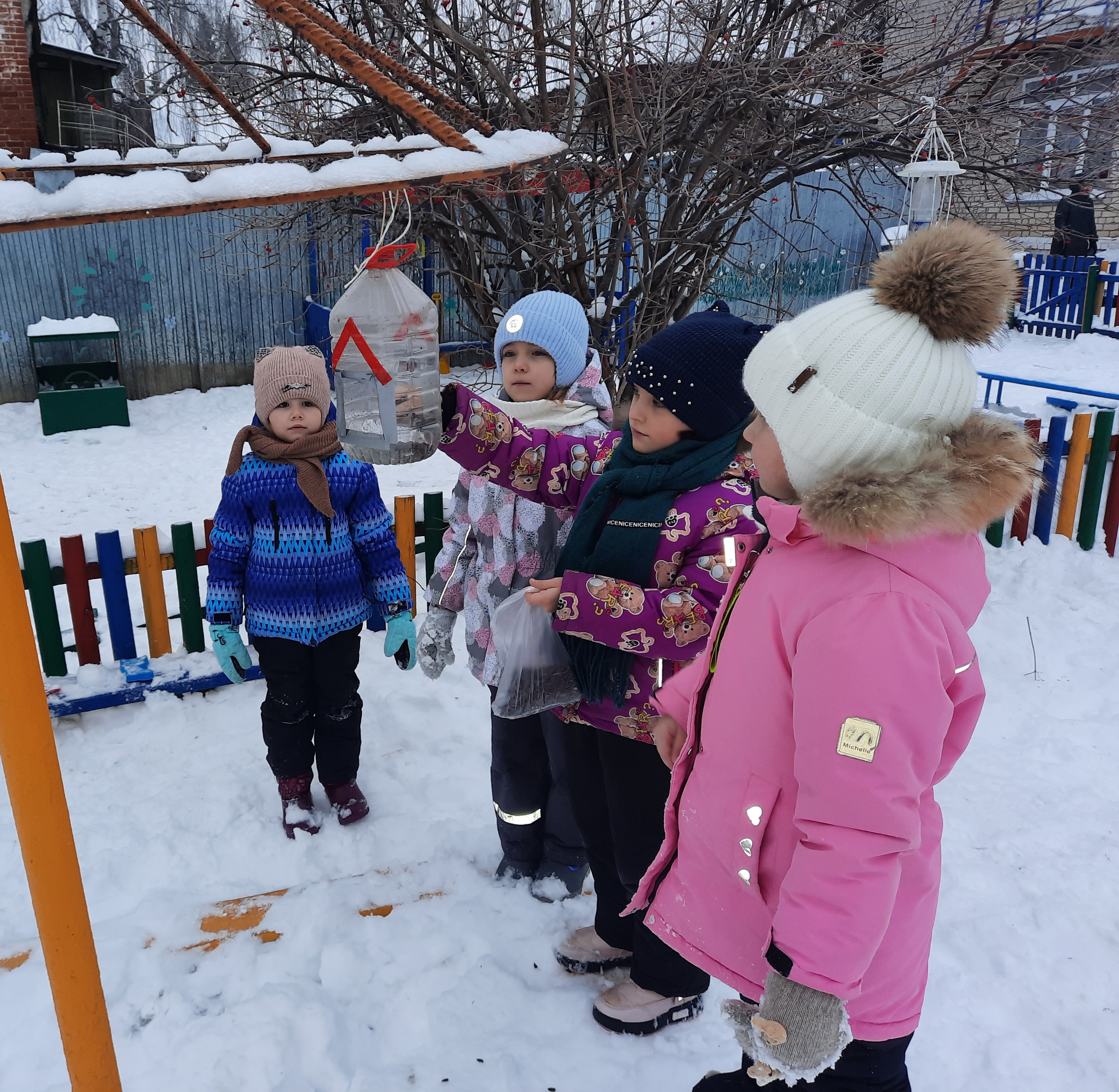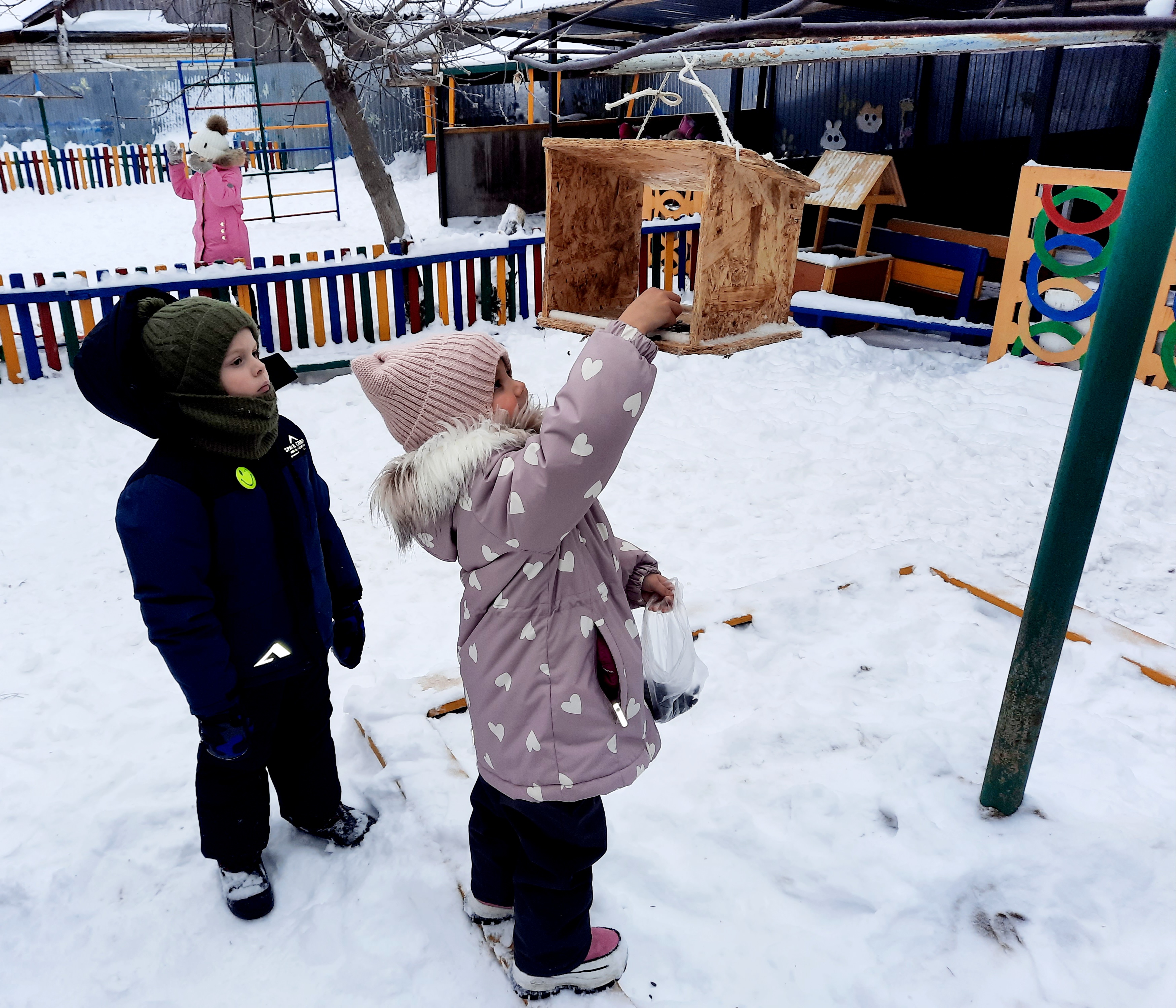 С этой целью с наступлением холодов на участках детского сада развешиваются кормушки, изготовленные ребятами совместно с родителями, и организовывается регулярная подкормка птиц.