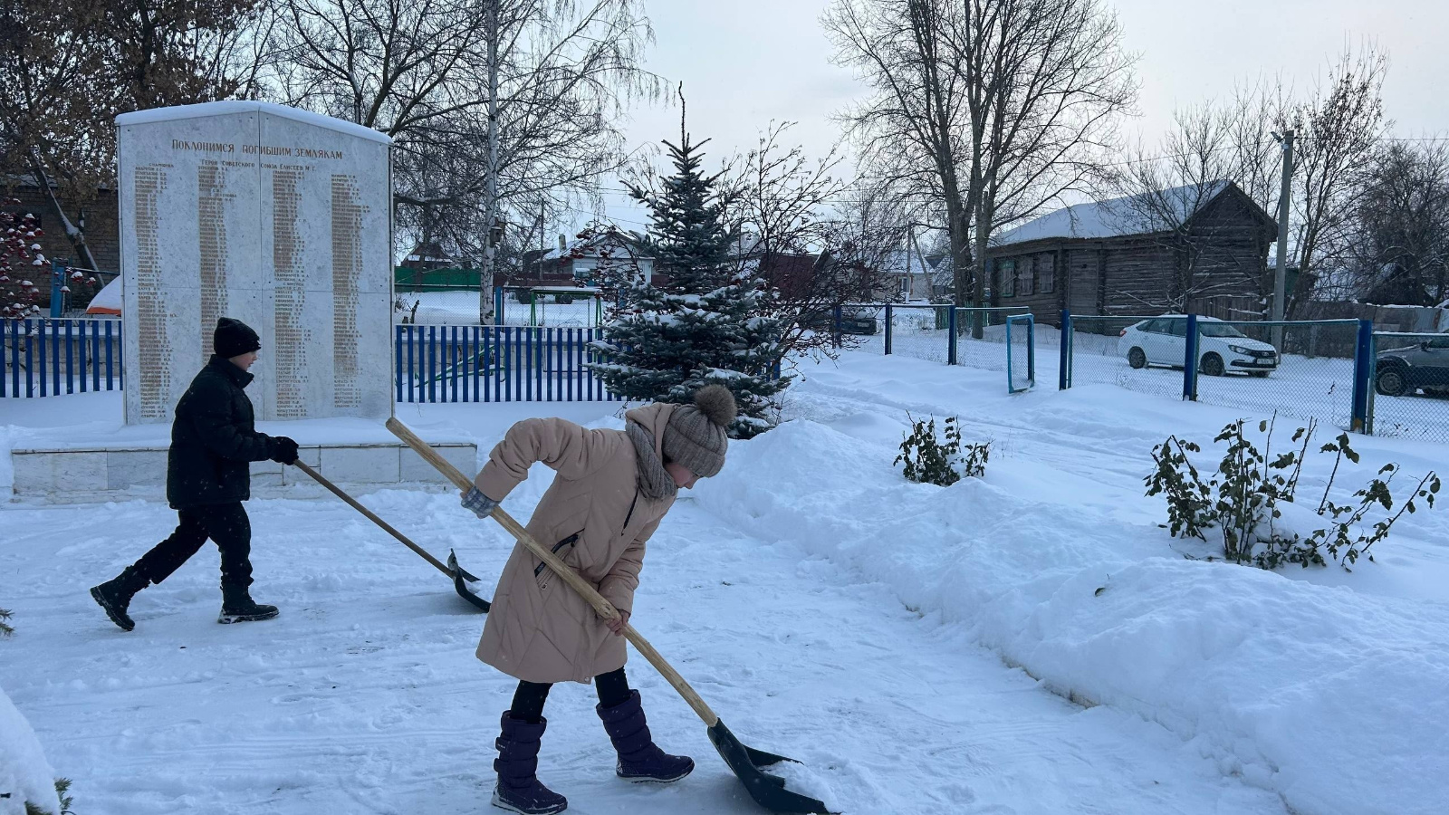 Наши юнармейцы Кузнецов Д., Сайфиева А., Кузьминых В. почистили территорию памятника от снега.