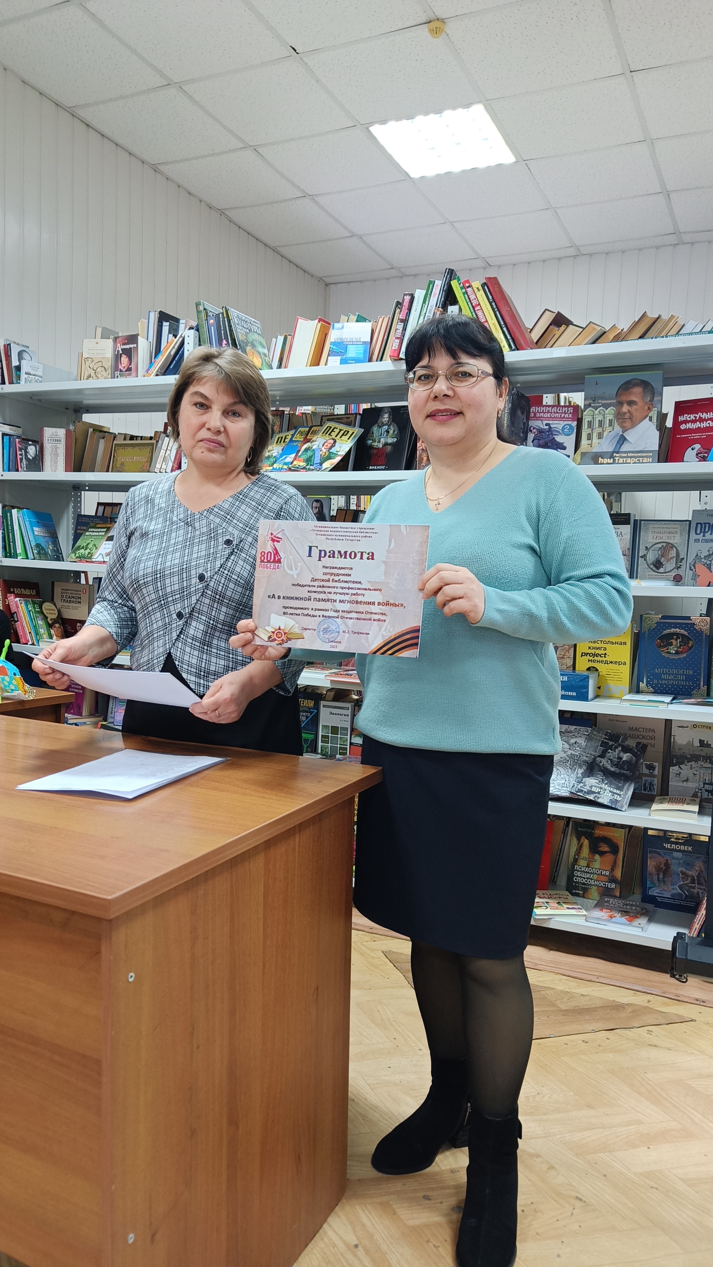 В рамках совещания состоялось награждение по итогам районного профессионального конкурса «А в книжной памяти мгновения войны». Грамотами победителей конкурса награждены: ведущий библиотекарь Жуковской поселенческой библиотеки – Малкина И.В., библиотекари Большетарханской поселенческой библиотеки – Маштеева И.Р., Абдрахманова Л.Р, библиотекари Кляшевской модельной библиотеки – Галимова Г.С., Амерханова Г.И., коллектив Детской библиотеки.