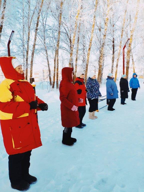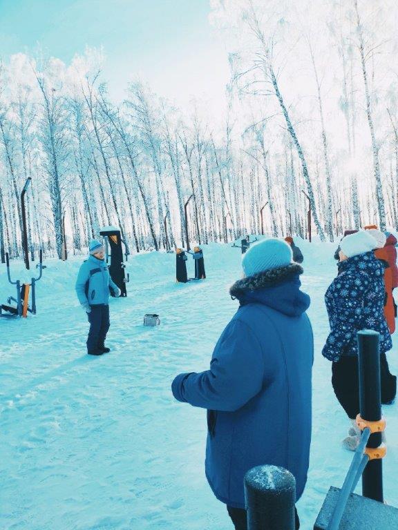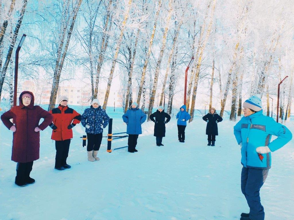 В рамках национального проекта "Спорт России" сегодня в морозный, но солнечный день в Парке Победы прошли занятия для группы здоровья «Молоды душой».