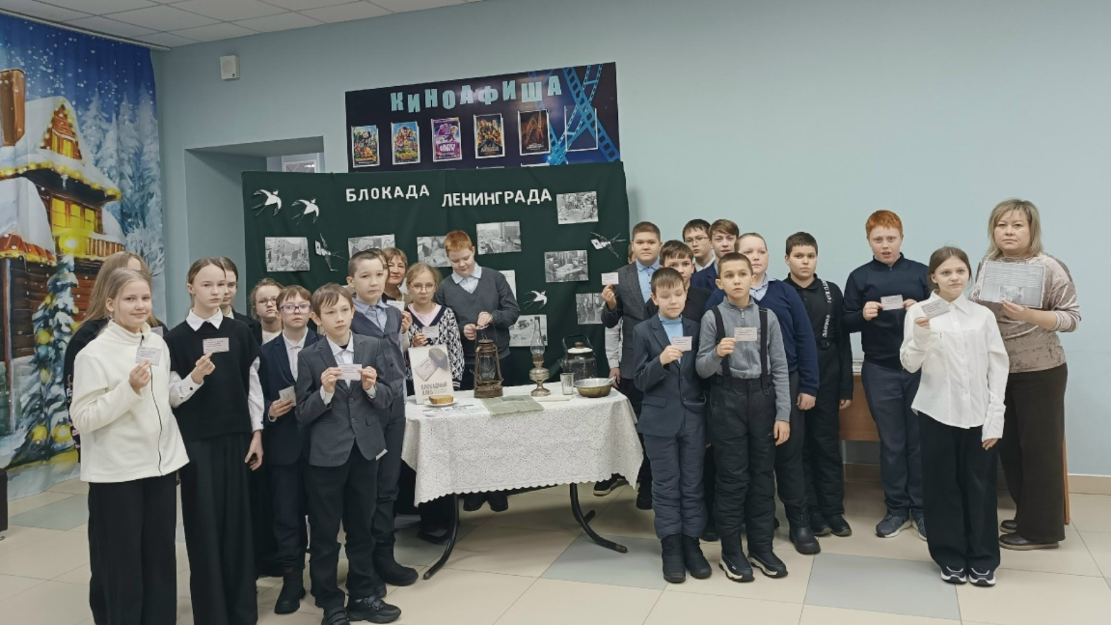 Ключевым символом мероприятия был кусочек хлеба в 125 граммов – суточная норма в самые страшные дни блокады. Рассказ о составе этого «хлеба», куда входила целлюлоза, обойная пыль и другие малопригодные для пищи добавки, произвел на ребят глубокое впечатление. Эта хлебная порция, стала самым наглядным и горьким свидетельством невероятных испытаний, выпавших на долю ленинградцев. Она заставила задуматься о цене жизни и истинном мужестве, заключавшемся в том, чтобы просто выжить и не сдаться. Мы попытались создать атмосферу блокадного Ленинграда. Ребята получили карточки на хлеб — такие же, как в далекие годы ВОВ жители блокадного Ленинграда, чтобы обменять их на кусочки хлеба, которые были дороже всех на свете сокровищ.