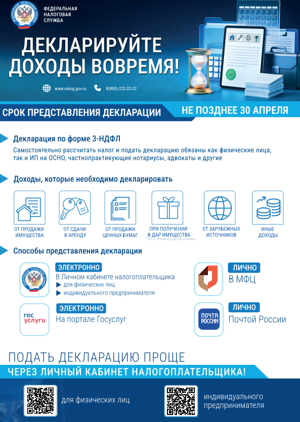 Стартовала декларационная кампания 2026 года, а это означает, что гражданам необходимо отчитаться о полученных в 2025 году доходах не позднее 30 апреля 2026 года.