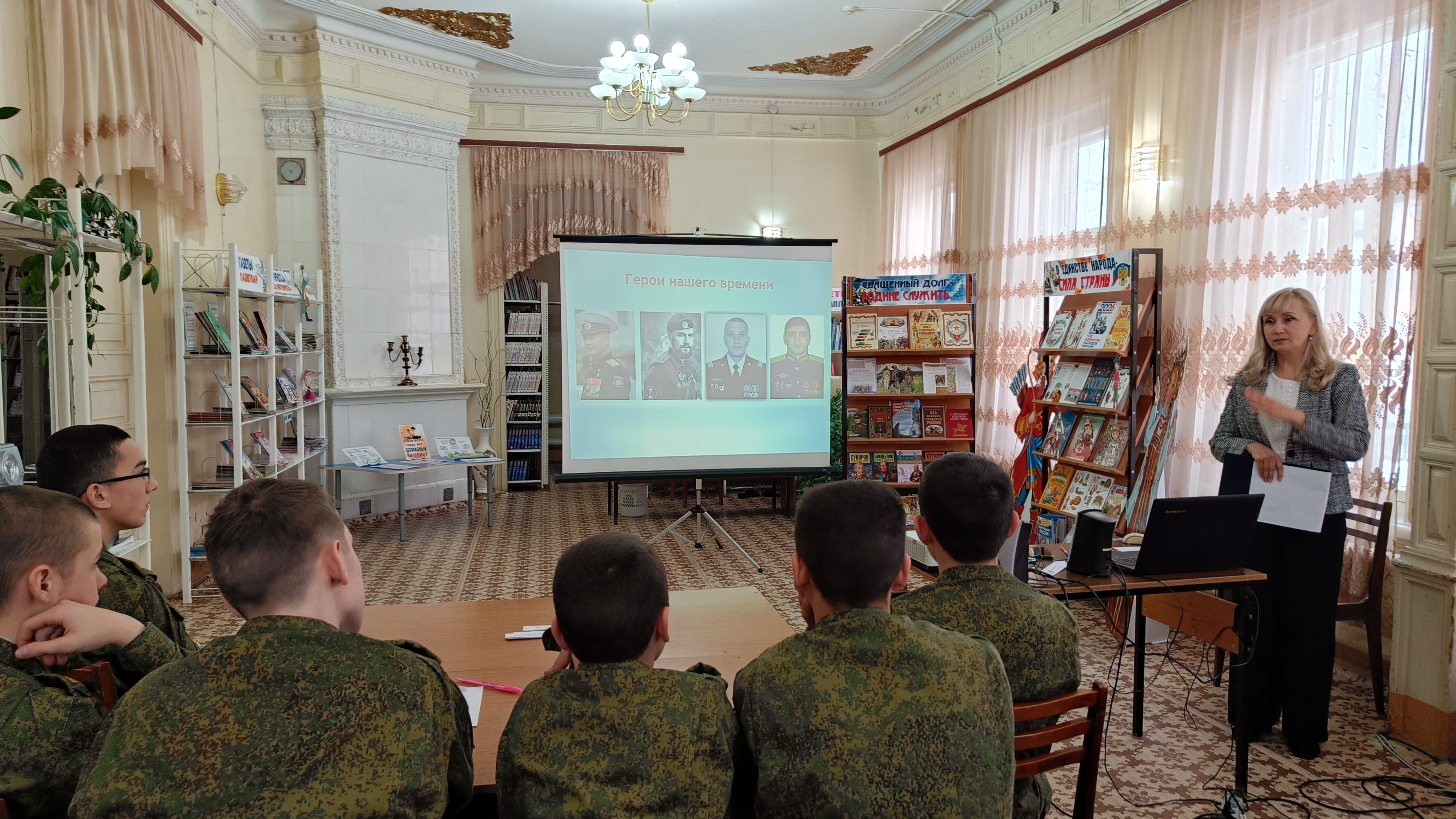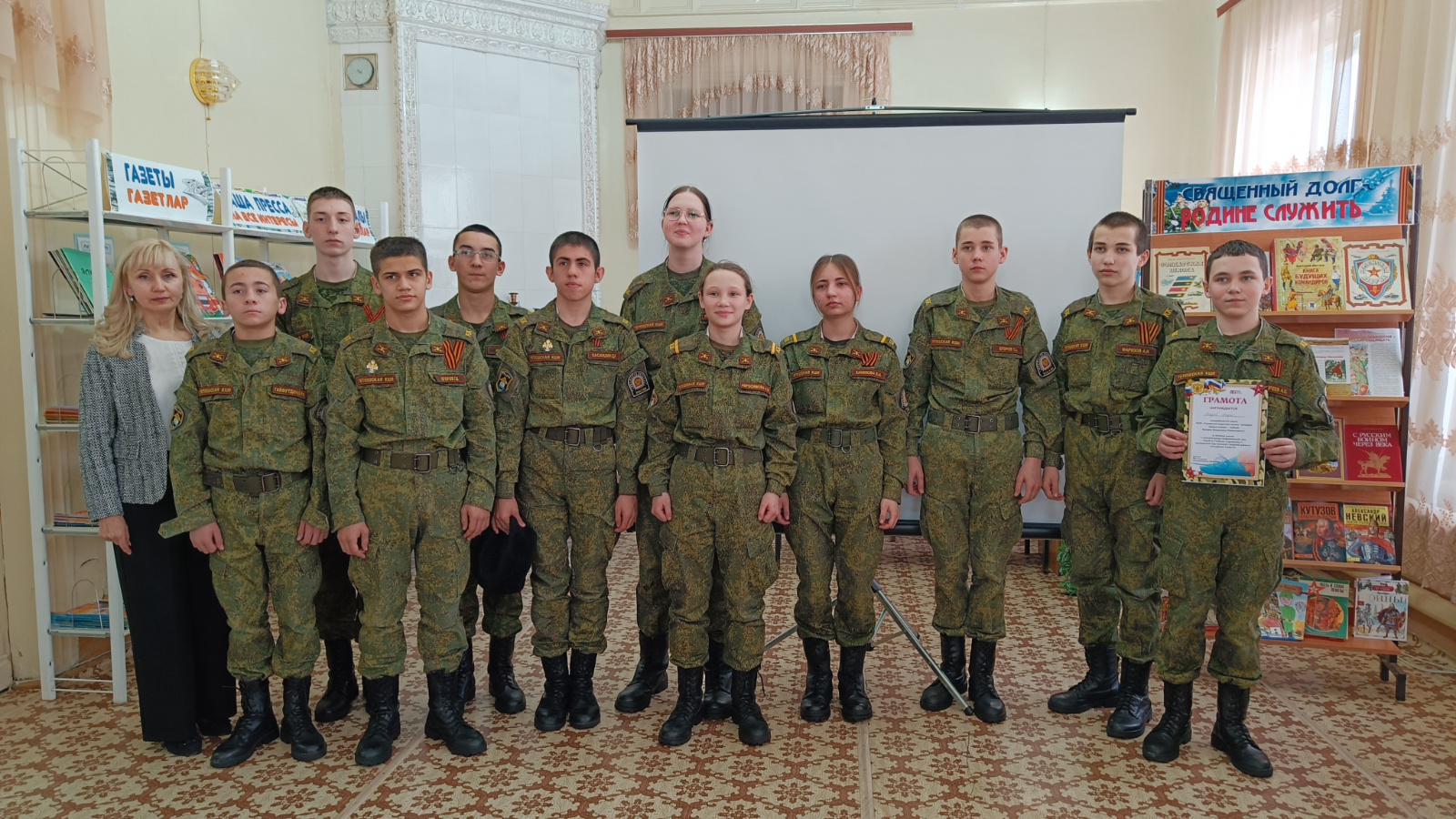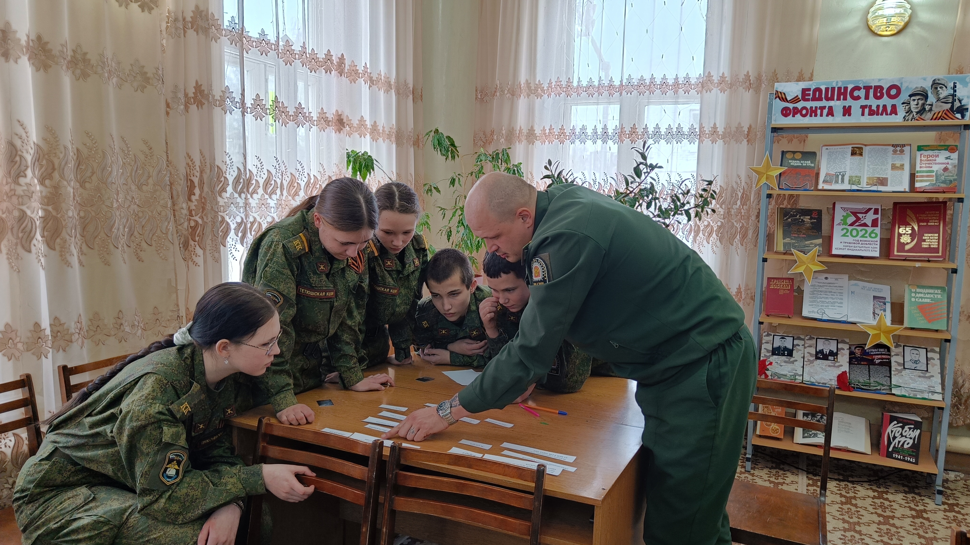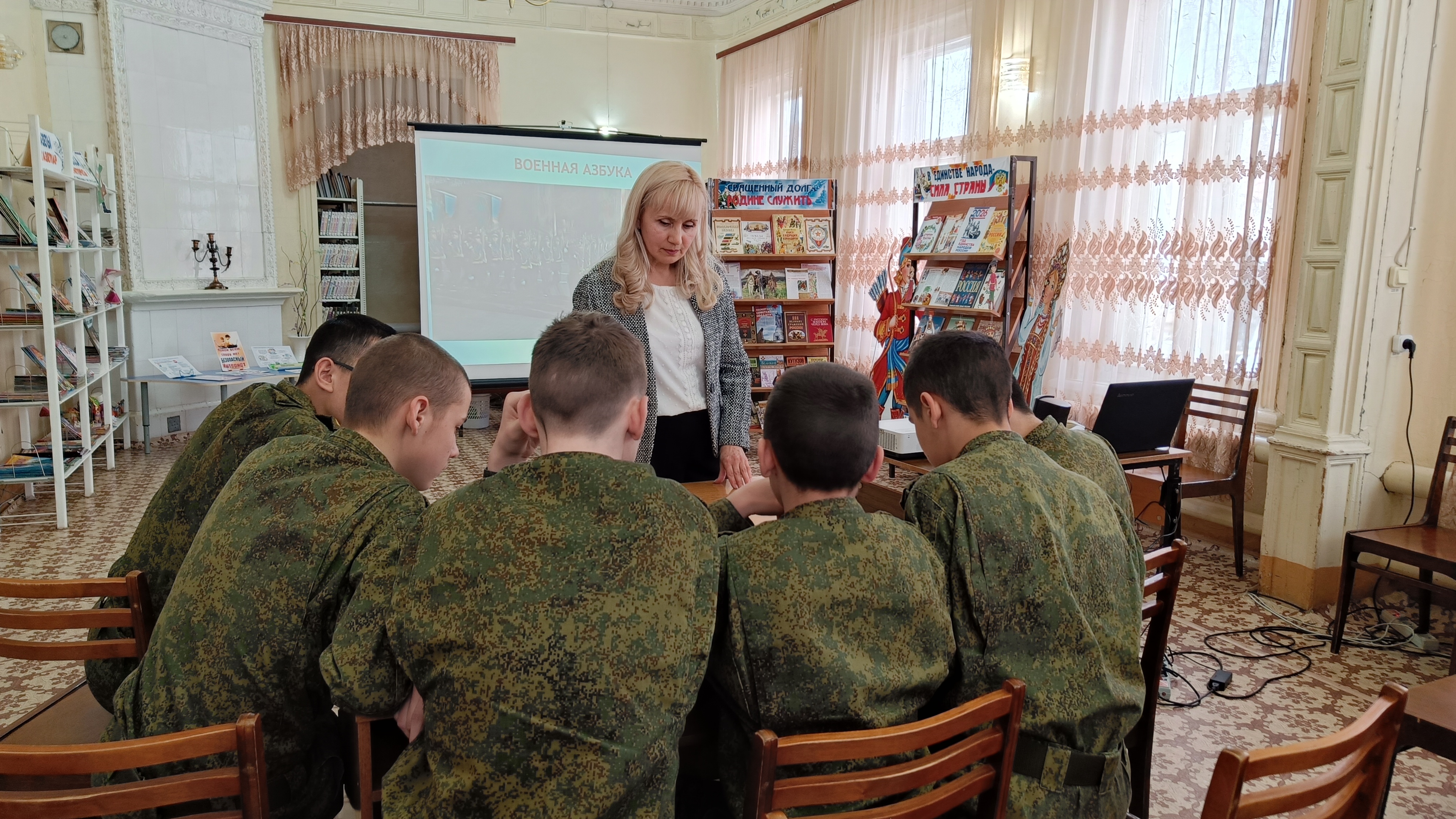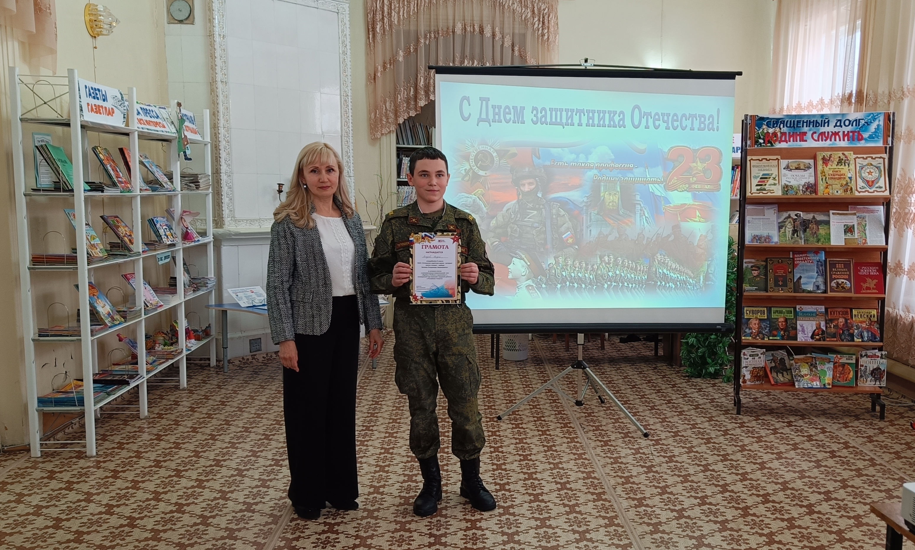 В рамках Федерального проекта «Пушкинская карта» в Детской библиотеке прошел интеллектуальный поединок «Будем Родине служить!», посвященный Дню защитника Отечества, в котором приняли участие воспитанники 8 класса ГБОУ «Кадетская школа-интернат имени генерал-майора Хапаева В.А.» (воспитатель Васин Н.М.).