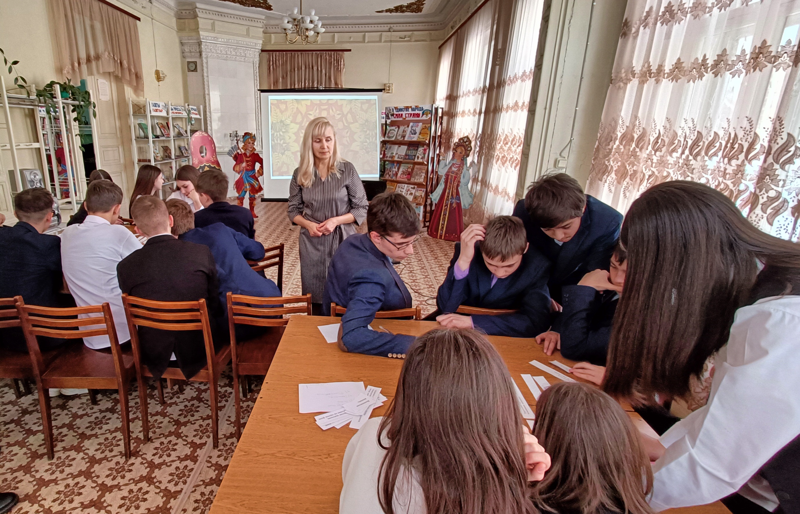 Сотрудники библиотеки рассказали, насколько многонациональна наша дружная страна, уделив особое внимание народам, проживающим на территории нашего района, о том, как мы уважаем традиции и обычаи, культуру и языки друг друга. Ребята разделились на команды и приняли участие в различных конкурсах, где угадывали музыкальные инструменты по их звучанию, называли предметы крестьянского быта, собирали пазлы на тему народных промыслов.