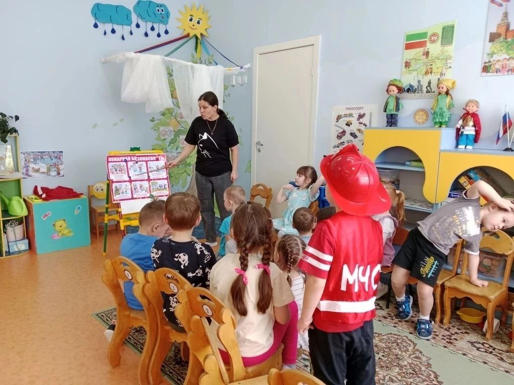 В рамках Года единства народов России, Года воинской и трудовой доблести в Республике Татарстана, а так же в рамках месячника оборонно-массовой, патриотической и спортивной работы и национального проекта «Молодежь и дети», подпроекта «Все лучшее детям», Всероссийского открытого урока культуры безопасности в нашем детском саду сегодня прошел единый день безопасности, с целью повышения уровня осведомленности детей о правилах поведения в чрезвычайных ситуациях, профилактике пожаров и обучении действиям при возникновении пожара. Воспитанники второй младшей группы познакомились с важными правилами поведения при пожаре, узнали, почему огонь бывает другом и врагом одновременно, научились вызывать экстренные службы и соблюдать меры осторожности. Самые маленькие воспитанники познакомились с пожарной машиной.