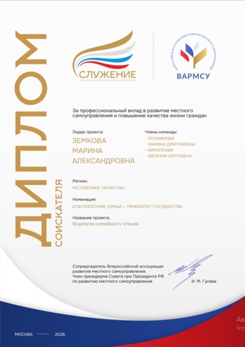 Земкова Марина Александровна, ведущий библиотекарь Центральной библиотеки, второй год подряд принимает участие во Всероссийской муниципальной премии «Служение» в номинации «Благополучие семьи — приоритет государства». В 2025 году её проект был отмечен Благодарностью, а в 2026 году - проект «Формула семейного чтения» получил диплом за профессиональный вклад в развитие местного самоуправления и повышение качества жизни граждан.