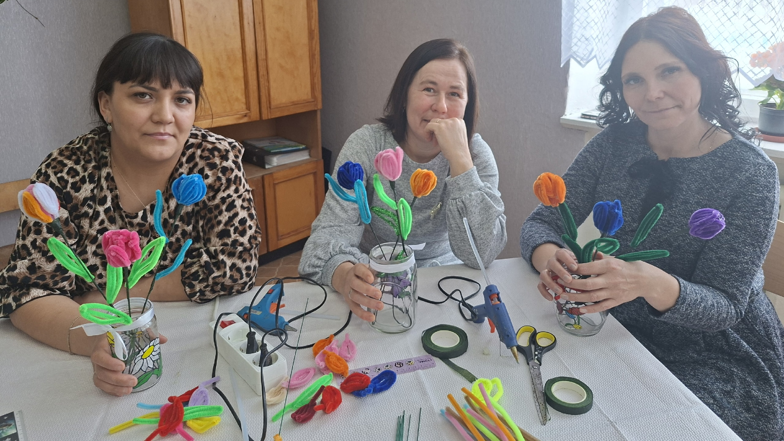 В рамках праздника состоялась увлекательная встреча — мастер-класс по изготовлению ярких тюльпанов из синельной проволоки. Под руководством девочек каждая мама смогла создать неповторимый подарок своими руками, добавив нотку творчества и индивидуальности в атмосферу торжества.