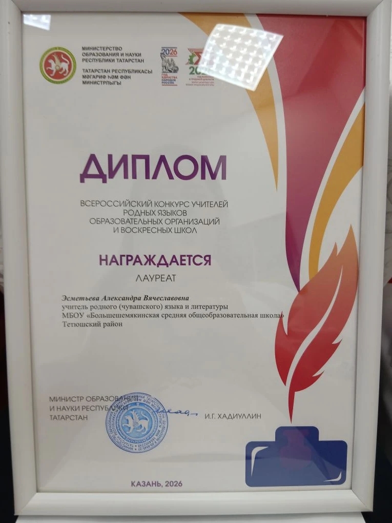 26 и 27 марта Эсметьева Александра Вячеславовна, учитель родного языка и литературы Большешемякинской средней общеобразовательной школы Тетюшского муниципального района, приняла участие во Всероссийском конкурсе учителей родных языков образовательных организаций и воскресных школ.