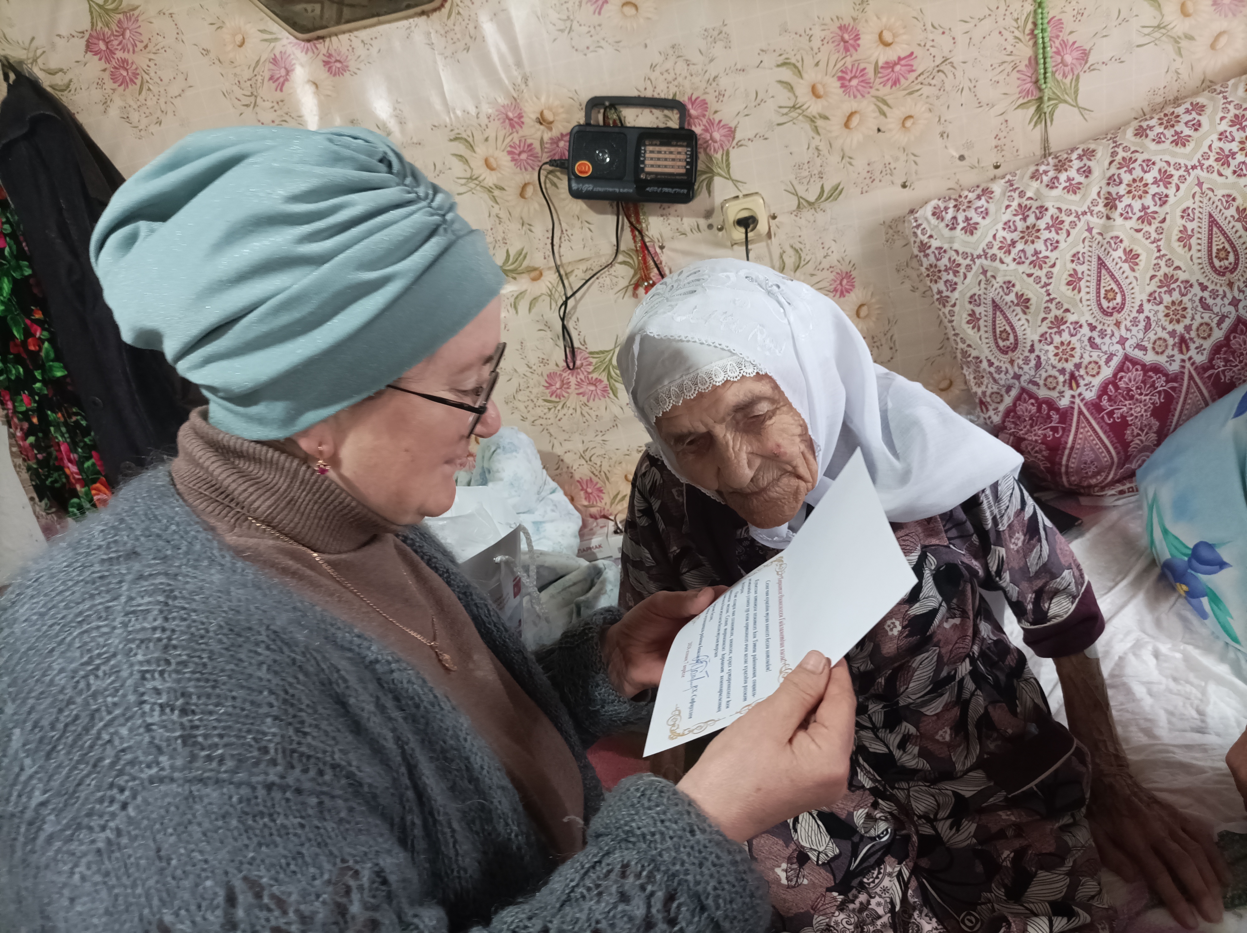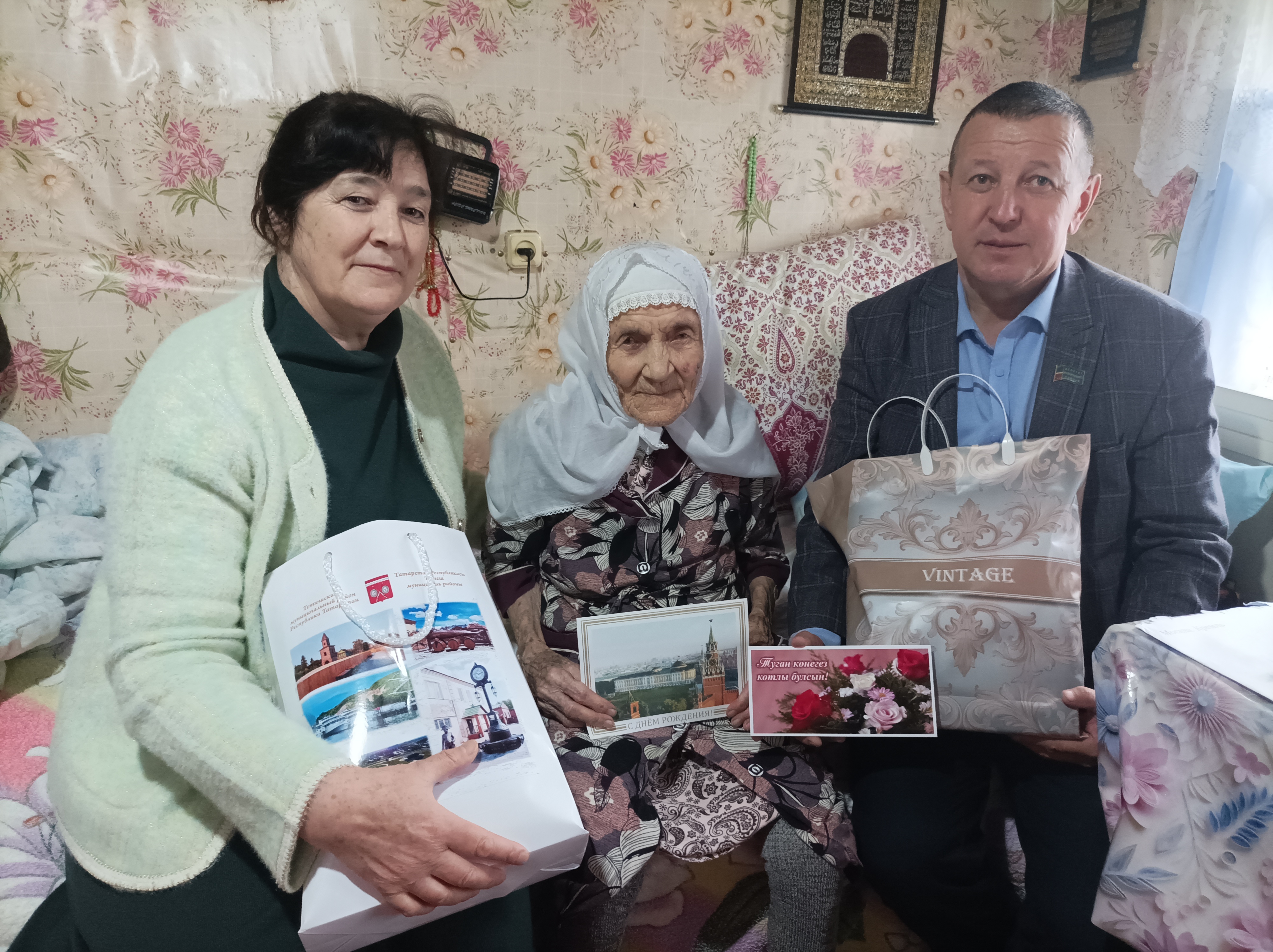 Поздравления Президента Российской Федерации Владимира Владимировича Путина, Главы Тетюшского муниципального района Рамиса Хатыповича Сафиуллова и от своего имени озвучили Глава Кляшевского сельского поселения Фанил Халимович Галимов, специалист Миляуша Камалетдинова и работники культуры, пожелали доброго здоровья и долгих, счастливых лет жизни, а также вручили памятные подарки.