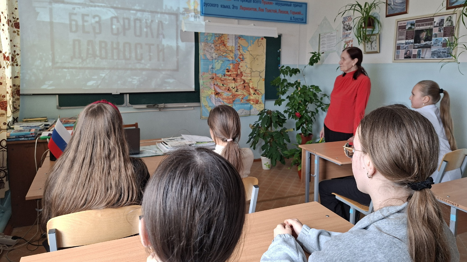 В рамках Всероссийской декады единых действий, приуроченной ко Дню памяти жертв геноцида советского народа нацистами и их пособниками в годы Великой Отечественной войны, в рамках реализации образовательно-просветительских мероприятий проекта «Без срока давности» с учащимися школы был проведён информационный час «О том, что было не забудем». Цель мероприятия - прикоснуться к одной из самых трагических страниц нашей истории.