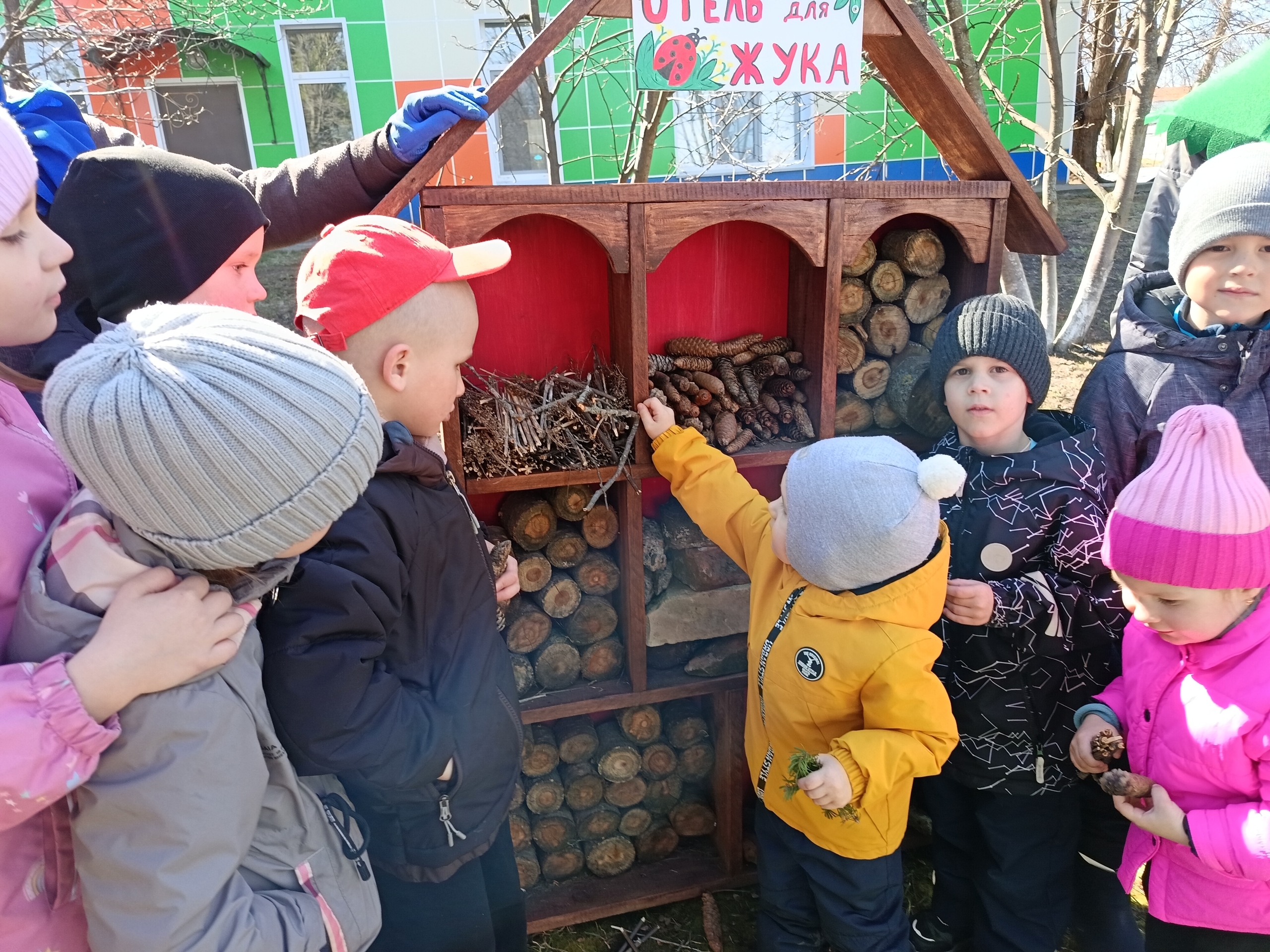 Главным событием дня стало торжественное открытие первого в нашем саду «Отеля для жука». Папа Лизы Яковлев А. А. смастерил домик, а ребята обустроили комнаты , где теперь смогут прятаться и отдыхать полезные насекомые.