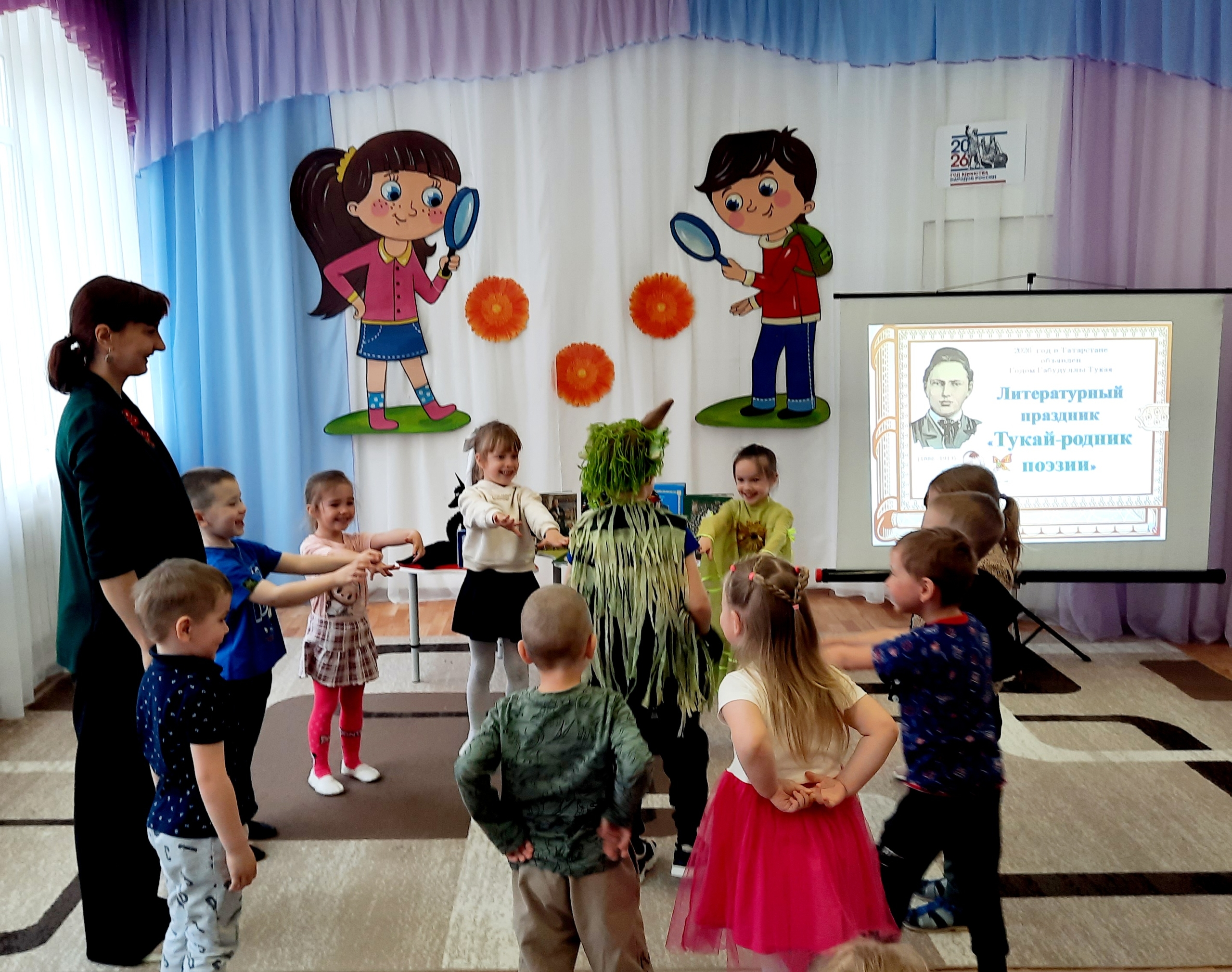 В преддверии дня рождения Габдуллы Тукая детский сад «Малыш» наполнился волшебством поэзии. Сотрудники Детской библиотеки организовали для малышей литературный праздник «Тукай — родник поэзии», погрузив их в мир великого татарского поэта.