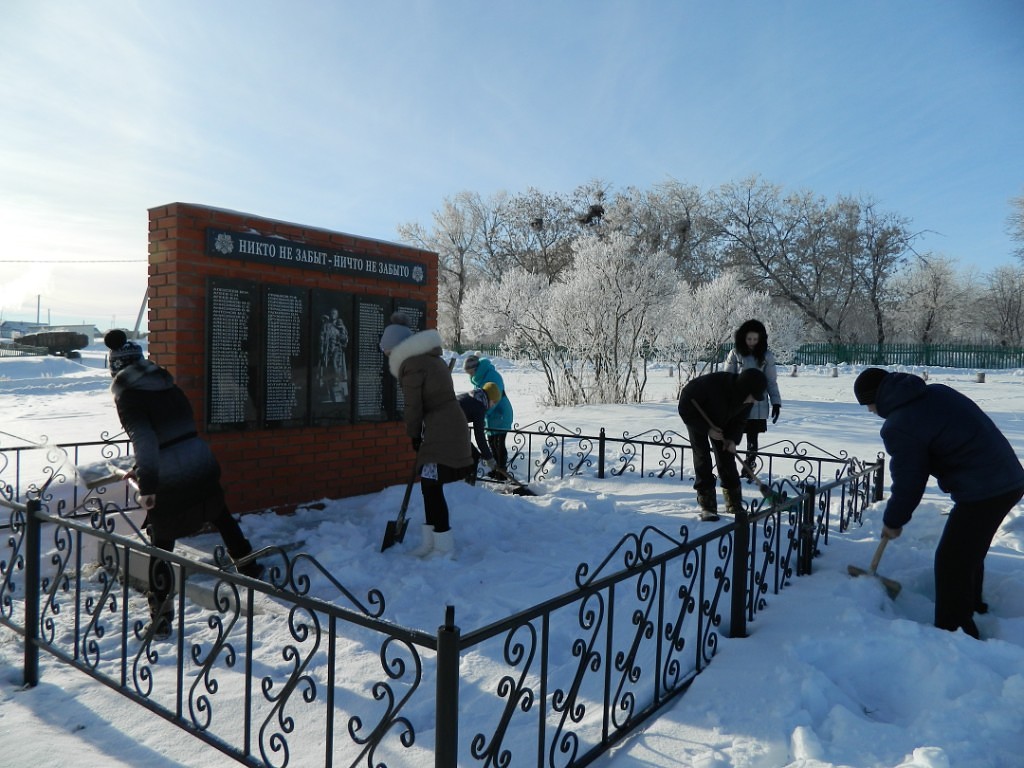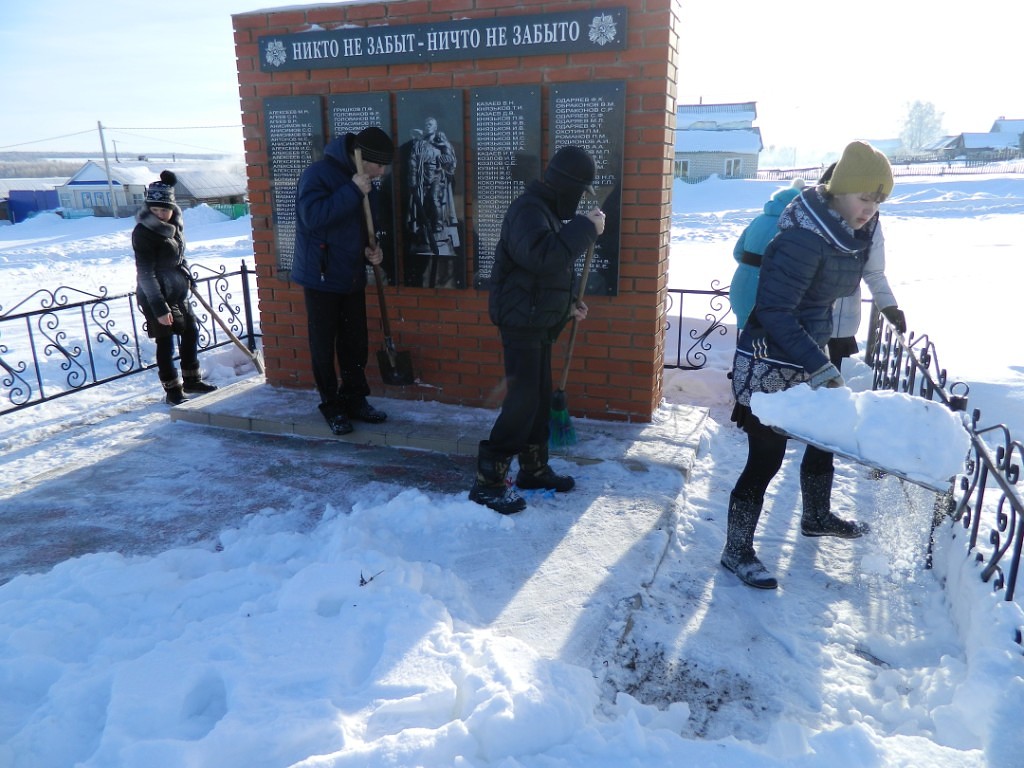 Учащиеся 8 класса вместе с педагогом-организатором Абраконовой Т.В. очистили от снега территорию около Памятника односельчанам, павшим в годы Великой Отечественной войны.