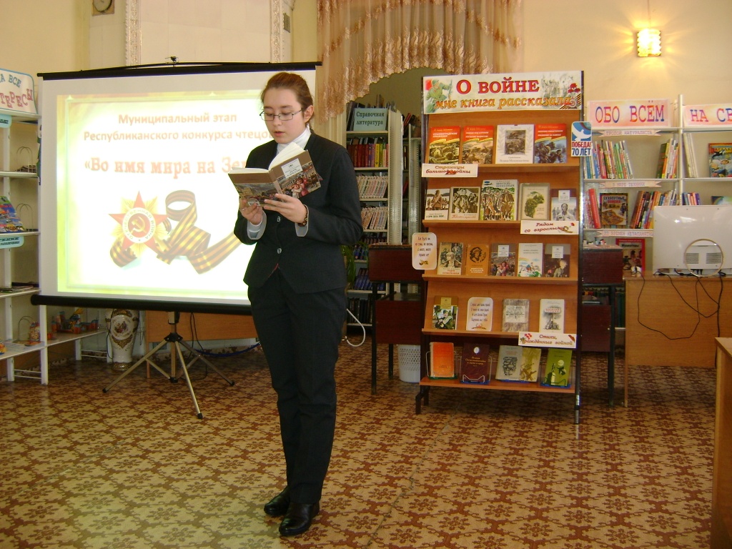 11 февраля в Детской библиотеке состоялся районный этап республиканского конкурса чтецов «Во имя мира на Земле», в котором приняли участие 47 учащихся школ города.