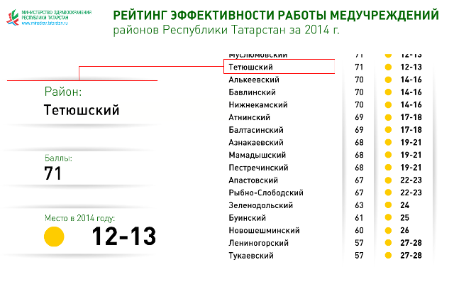 Отрадно заметить, что по итогам 2014 года в общем рейтинге учреждений здравоохранения муниципальных образований Тетюшский район, значительно улучшив свои показатели, занимает 12 место, а по оценке деятельности медицинских учреждений - 2 место среди всех районов и городов РТ.