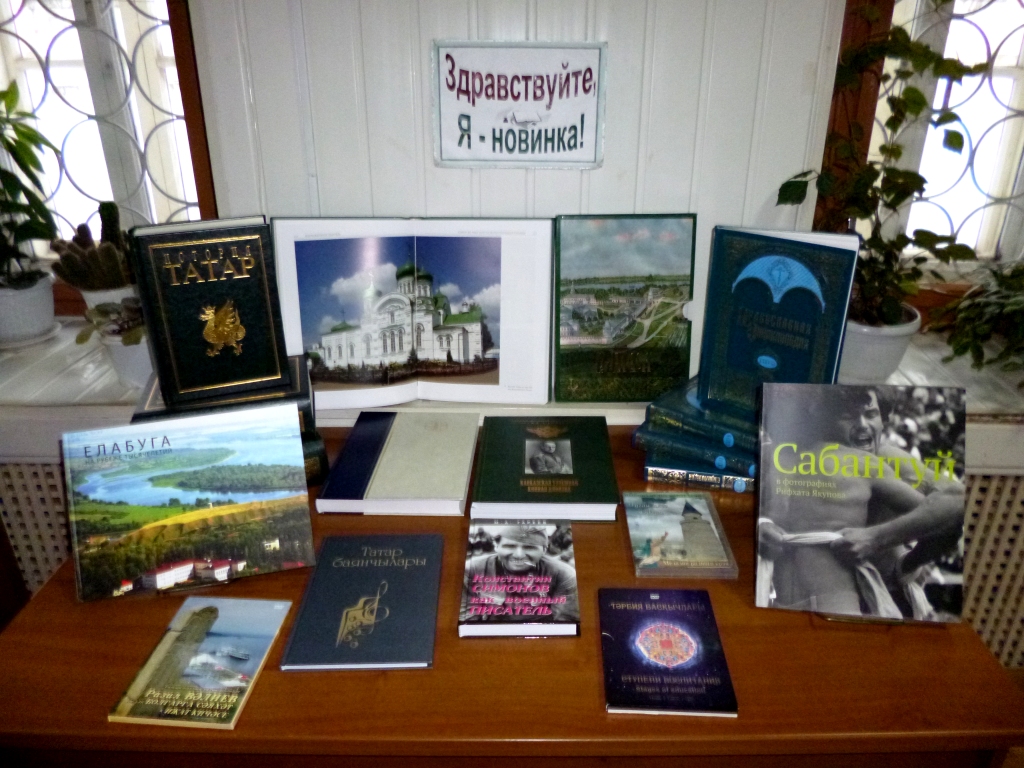 Центральная библиотека регулярно проводит выставку книг с целью ознакомления читателей с новинками, пополнившими библиотечный фонд. Так, в читальном зале оформлена книжная выставка – обзор «Здравствуйте, я новинка!». Тематика разнообразна - Православная энциклопедия, Большая советская энциклопедия, книга – альбом «Елабуга», DVD о Болгарах, книга в фотографиях Р. Якупова «Сабантуй», «Константин Симонов как военный писатель» Гареева М.А., в которой автор исследует творчество выдающегося писателя и участника войны, книга «Раифа» посвящена духовному центру российского православия – Раифскому Богородицкому монастырю и др.