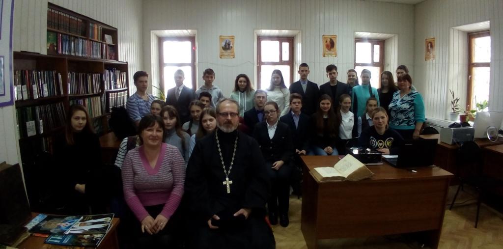 Сегодня в читальном зале Центральной библиотеки состоялось мероприятие «Живое слово мудрости», на котором присутствовали учащиеся 9 «В» класса МБОУ «Тетюшская СОШ №1 им. П.С. Ханжина» под руководством Елены Владимировны Черновой. Почетным гостем на мероприятии был Отец Валентин - настоятель Троицкого собора города Тетюши.