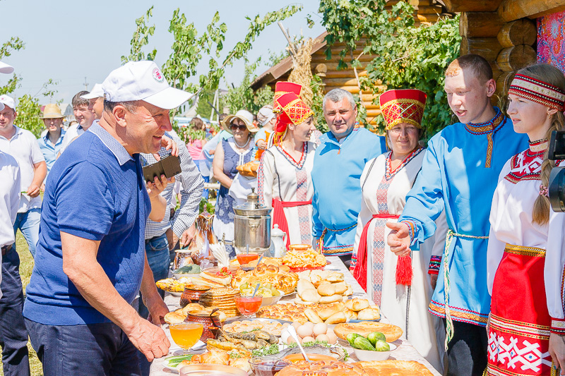 Высоких гостей встречали с присущим тетюшанам гостеприимством, хлебом-солью, чак-чаком и пивным напитком-сыра.
