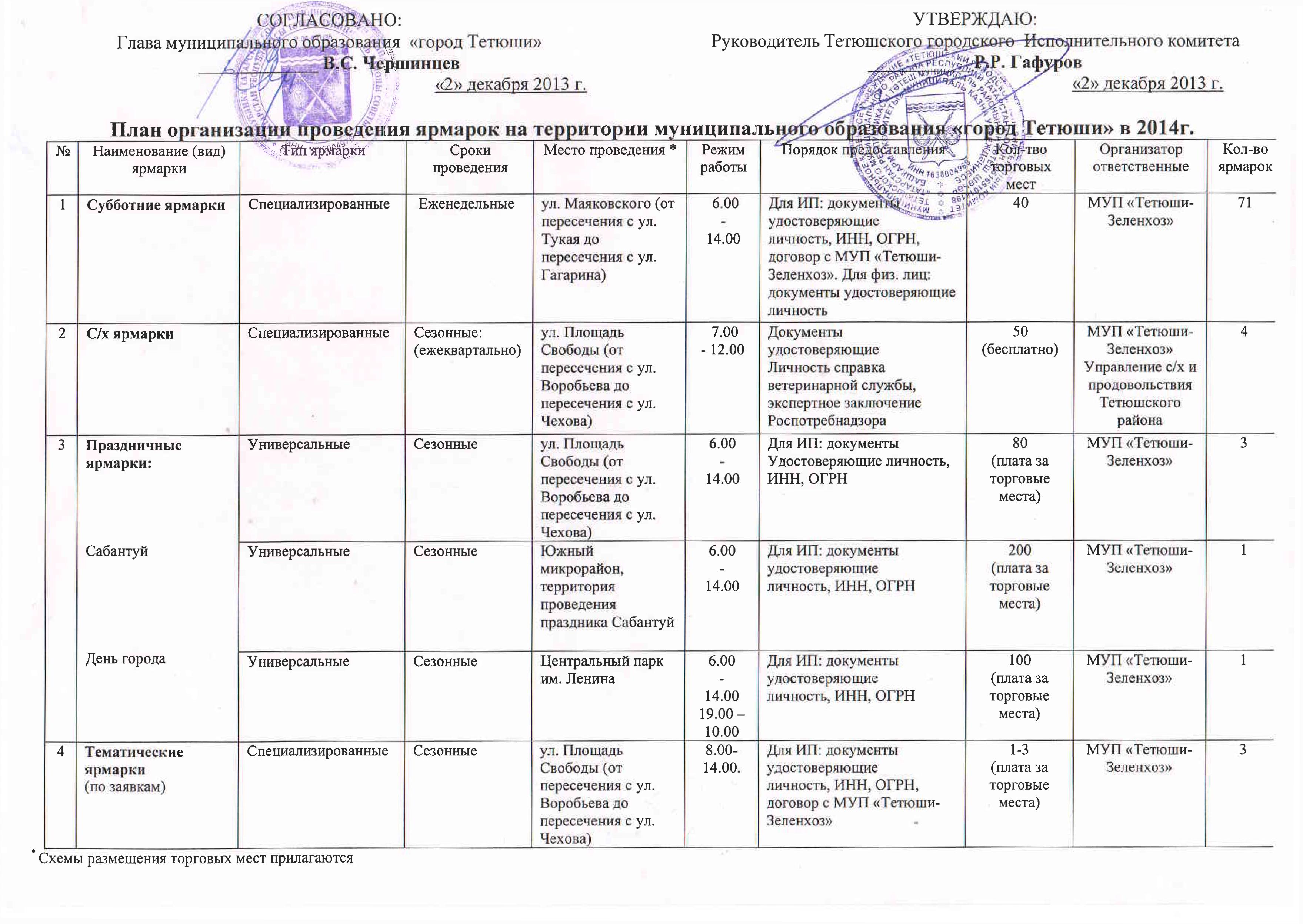 Об определении мест проведения ярмарок на территории города Тетюши в 2014 году