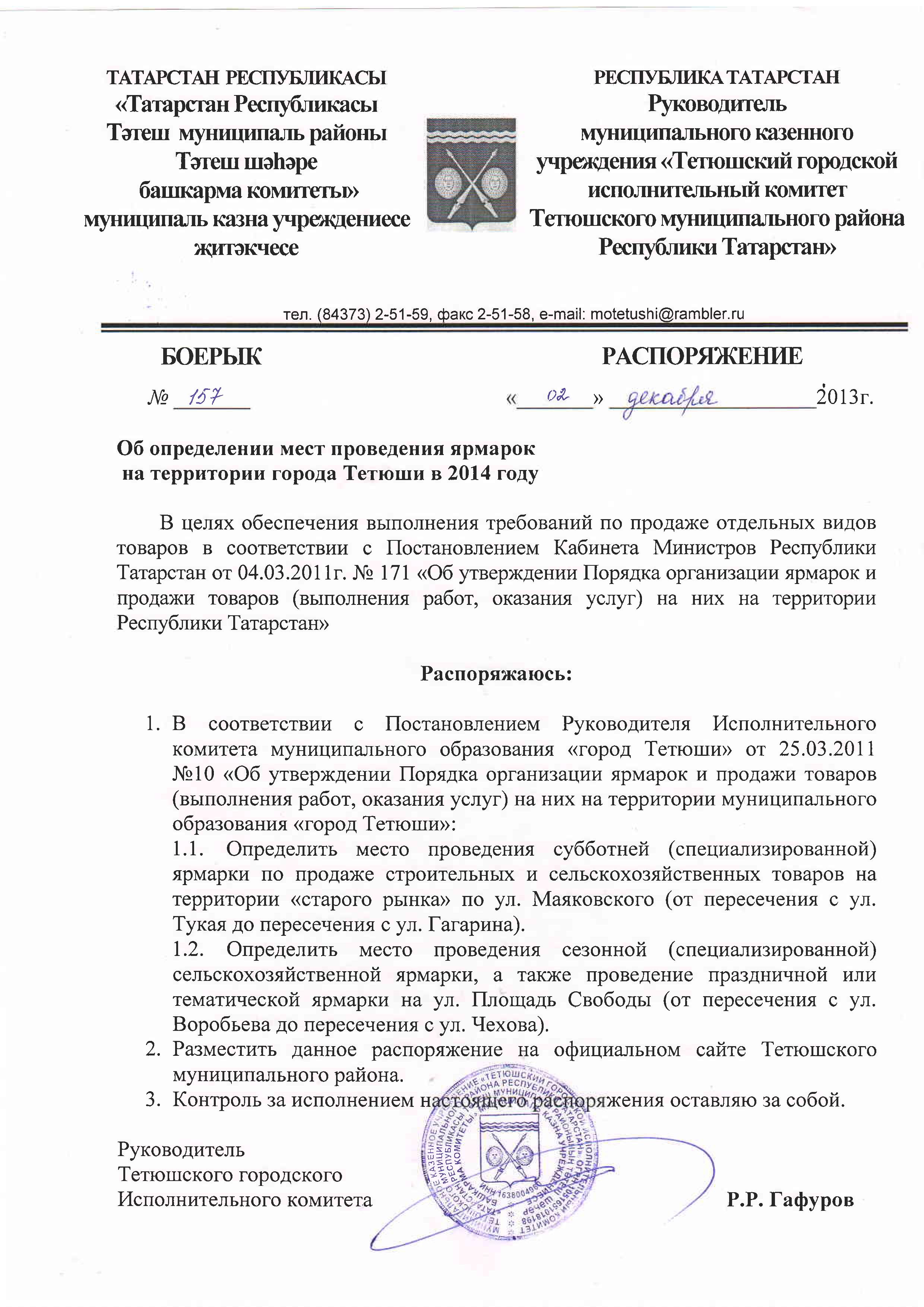 Распоряжение руководителя городского исполкома от 02.12.2013 № 157 "Об определении мест проведения ярмарок на территории города Тетюши в 2014 году"