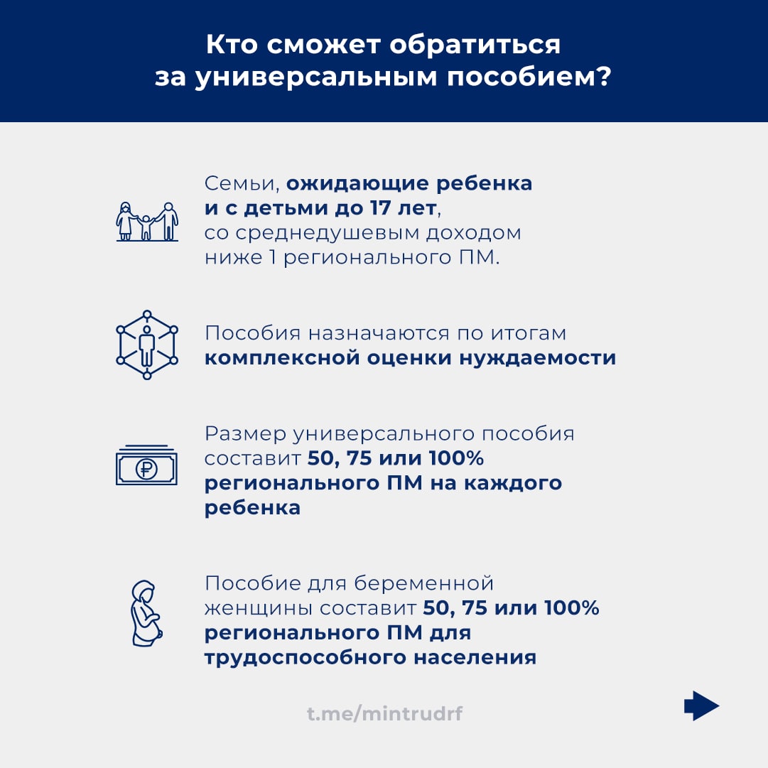 ✔рост поддержки для беременных женщин, вставших на учет в ранние сроки — пособие будет назначаться в размере 50, 75 или 100% регионального прожиточного минимума трудоспособного.