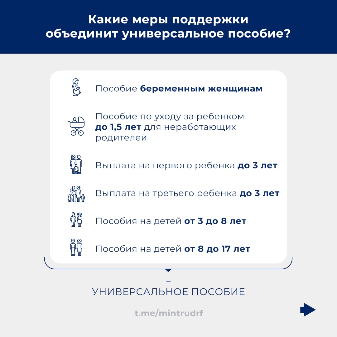 С 1 января 2023 года будет введено единое универсальное пособие. Оно объединит действующие меры поддержки семей с детьми от беременности женщины до исполнения 17 лет ребенку. Оператором универсального пособия станет Социальный фонд России.