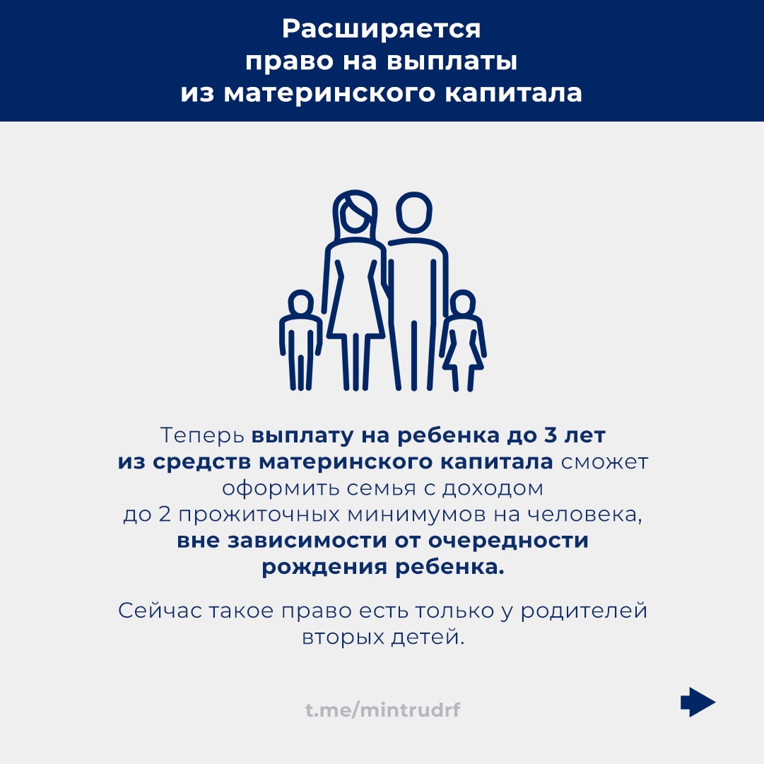 Дополнительно устанавливается возможность оформить выплату из материнского капитала для всех детей до 3 лет, вне зависимости от очередности рождения, если доход семьи — меньше двух прожиточных минимумов на человека.
