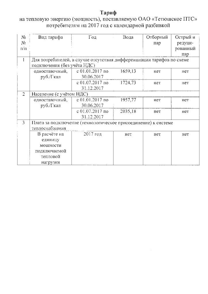 Тарифы на тепловую энергию ОАО "Тетюшское ПТС" на 2017 год