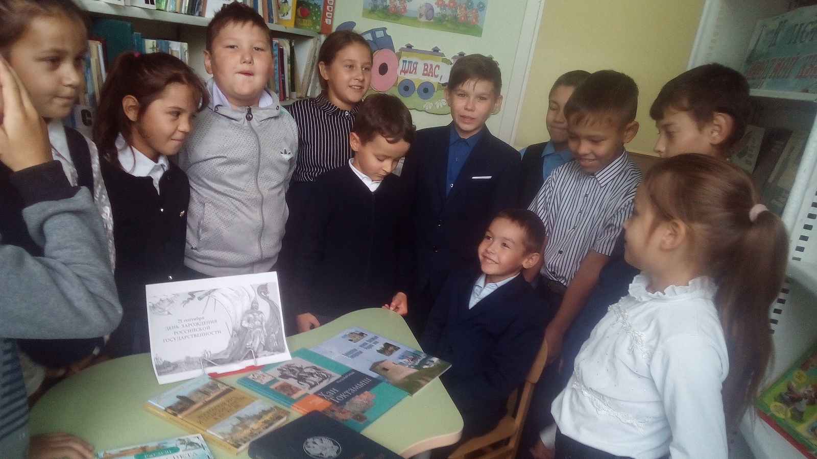 Быел «Варяглар чакыруы» дип аталган вакыйгага 1160 ел тула һәм Россия дәүләтчелегенең барлыкка килүен билгели. Бу вакыйгага карата, китапханә, «Бакырчы урта мәктәбе» нең башлангыч сыйныф укучылары өчен «борынгы Русьтән алып яңа Россиягә кадәр» дигән мәгълүмат сәгате үткәрде. Укучылар "башлангыч рус елъязмасы” белән таныштылар – “вакытлы еллар повесте" дип атау гадәти күренеш. Ул Рәсәй җире башлану белән, кенәзлек өчен үзара сугыш һәм Варяг кенәзлегенә патша-хакиме һәм варяг рюрикны Русь белән идарә итә башлаган. Балаларга М.О. Микешин проекты буенча «Россиянең меңьеллыгы» һәйкәле турында сөйләделәр. 1862 елда ул Бөек Новгородта Россиянең дәүләт һәм мәдәни төзелеше эшенә зур өлеш кертүе уңаеннан ачыла. Һәйкәл гадәти түгел, гомуми үзенчәлекләр белән кыңгырауны хәтерләтә. Русь хакимнәре, мәгърифәтчеләр, полководецлар, җәмәгать эшлеклеләре, язучылар, рәссамнар бик күп скульптуралар белән дә таныш. Балалар викторина сорауларына җавап бирделәр. Рәсәй безне бердәм булырга өйрәтә,бердәм булганда гына дус,тату яшәп була дигән төшенчәгә киләбез.