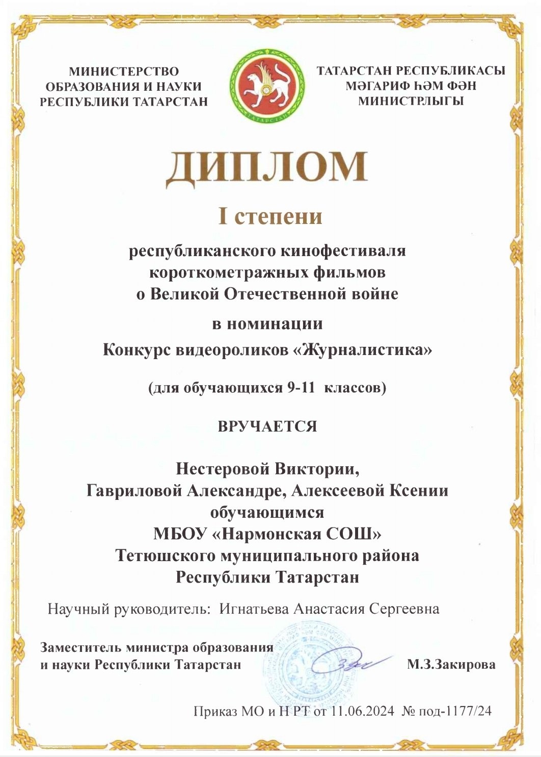 Бөек Ватан сугышы турында кыска метражлы фильмнарның республика кинофестиваленә йомгак ясалды. Нармонка мәктәбе укучылары Нестерова В., Гаврилова А., Алексеева К. "Журналистика" номинациясендә 1 дәрәҗә диплом белән бүләкләнәләр (җитәкчесе Игнатьева А. С.).