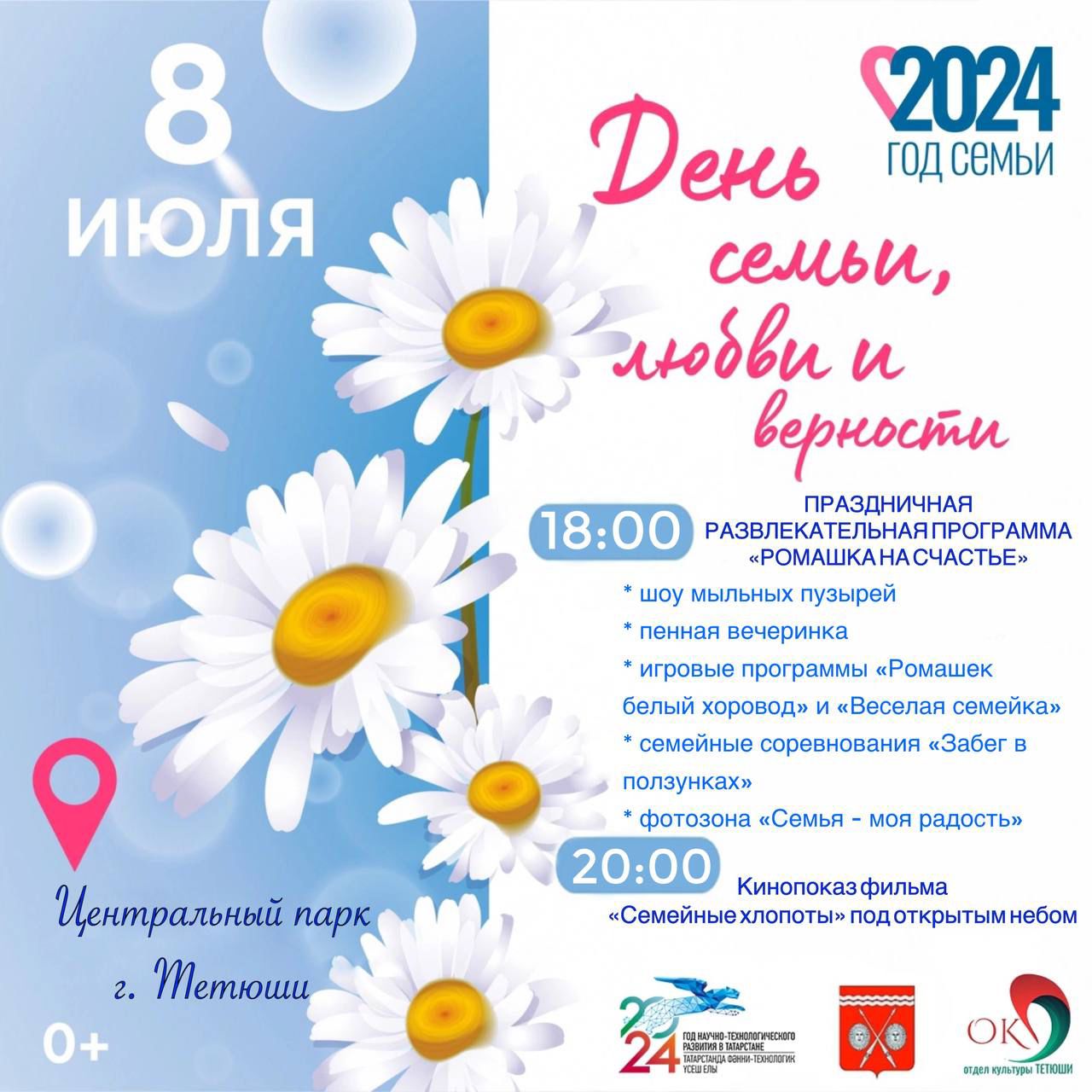 8 июль 18.00 сәгатьтә Тәтеш шәһәренең Үзәк паркында Бөтенроссия Гаилә, мәхәббәт һәм тугрылык көненә багышланган «Бәхеткә Ромашка» бәйрәм күңел ачу программасы узачак.