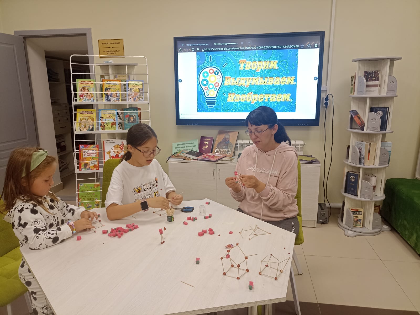 Ташландык материалдан эшләнмәләр ясау-кызыклы шөгыль, махсус күнекмәләр таләп итми, иҗади якын килү җитә. Иҗади остаханәдә катнашучыларга китапханәче гади кухня поролон губкалары, пластилин һәм теш чистарткычлар ярдәмендә төрле фигураларны ничек ясарга мөмкинлеген күрсәтте. Балалар иҗат процессында актив катнаштылар. Алар поролонны кечкенә квадратларга кисеп, бер-берсенә теш чистарткычлар белән беркеттеләр. Тиздән төрле геометрик фигуралар барлыкка килде. Яшь уйлап табучыларга кызыклы шөгыль бик ошады, мастер – класста катнашучыларның барысы да уңай эмоцияләр һәм кызыклы тәҗрибә алдылар.
