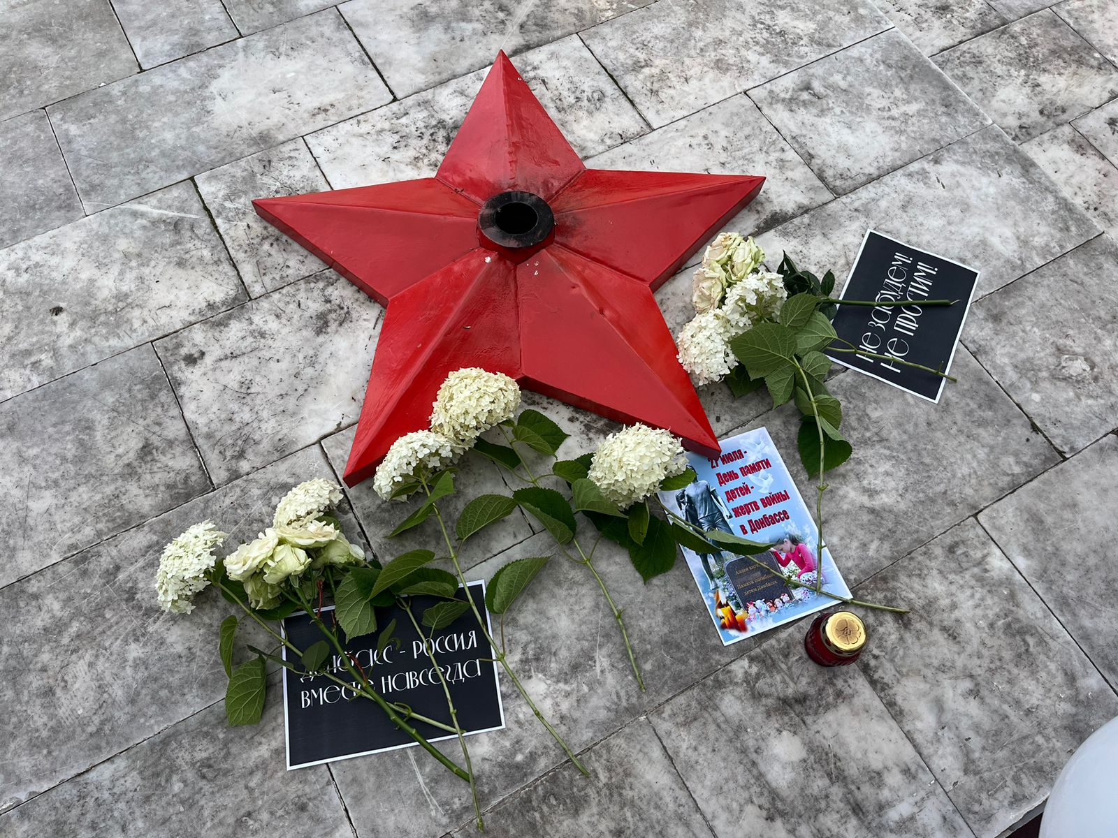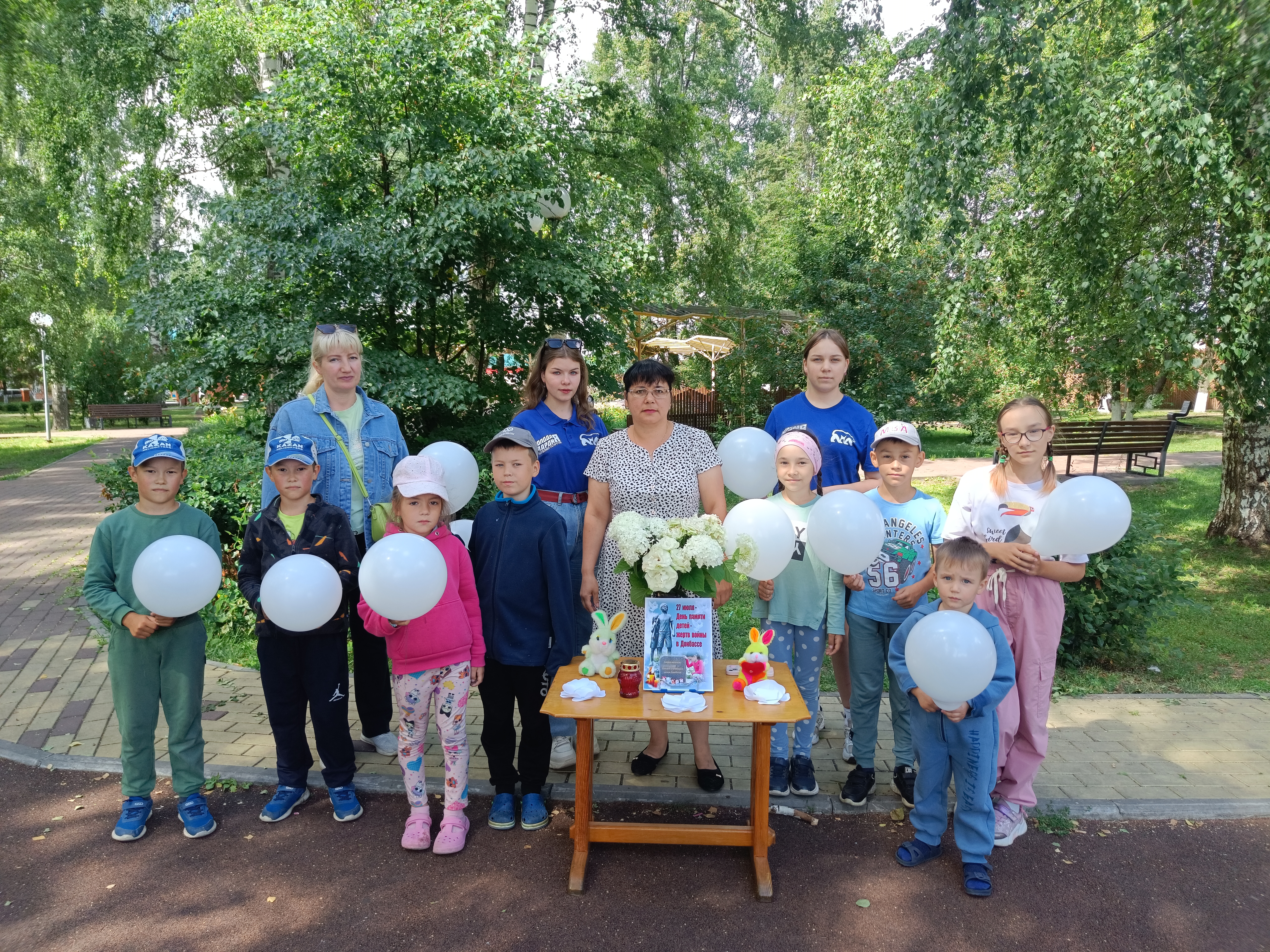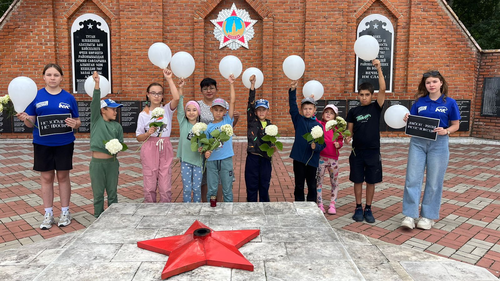 Чарада катнашучылар Донбассның вакытсыз киткән фәрештәләре истәлегенә күккә ак шарлар очырдылар-балалар күңеленең чисталыгы символы, алар инде беркайчан да олылар булмаячак-һәм чәчәкләр салдылар.