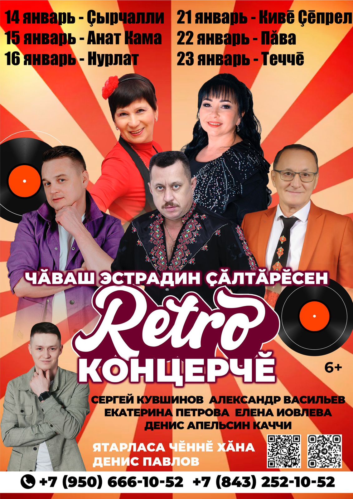 23 гыйнвар 19.00 сәг. Тәтеш район мәдәният йортында чуваш артистлары Сергей Кувшинов, Александр Васильев, Екатерина Петрова, Елена Иовлева, Денис һәм махсус чакырылган кунак Денис Павлов белән берлектә «Ретро концерт» булачак.