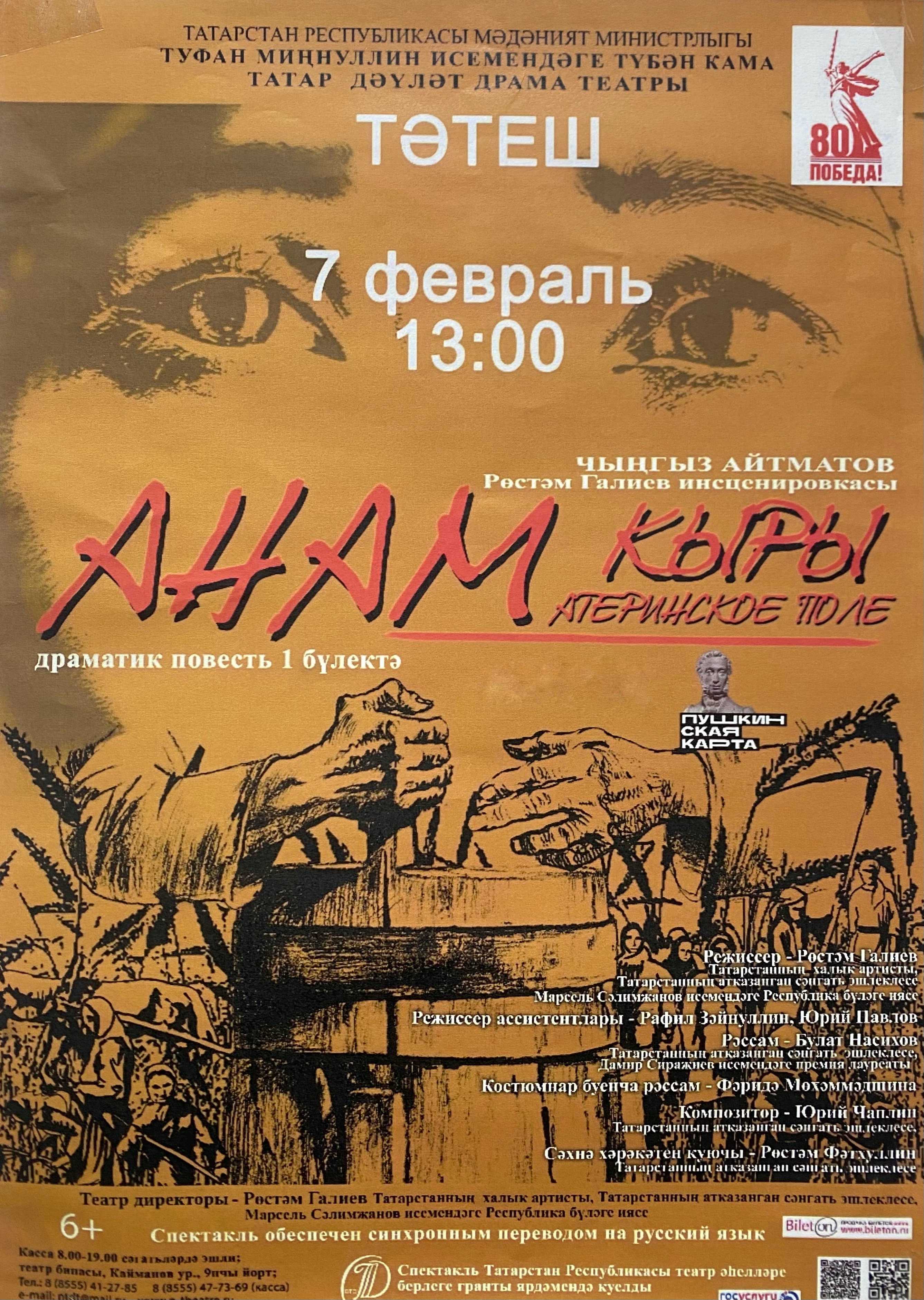 Билетларны район мәдәният йорты кассасыннан һәм онлайн - https://bileton.ru/events/spektakl-materinskoe-pole-anam-kyry-184723 алырга мөмкин. Спектакль «Пушкин картасы» программасында катнаша .