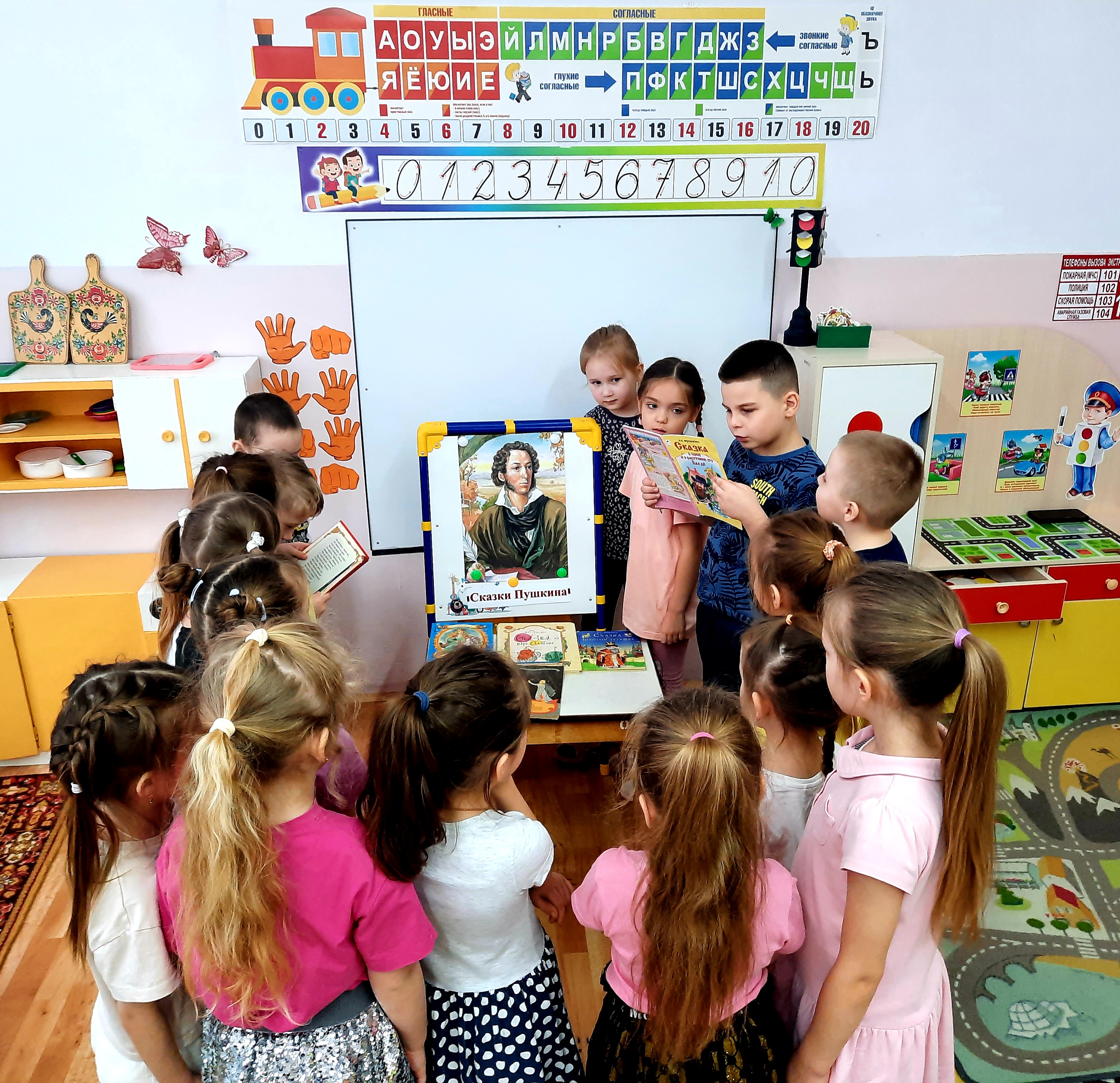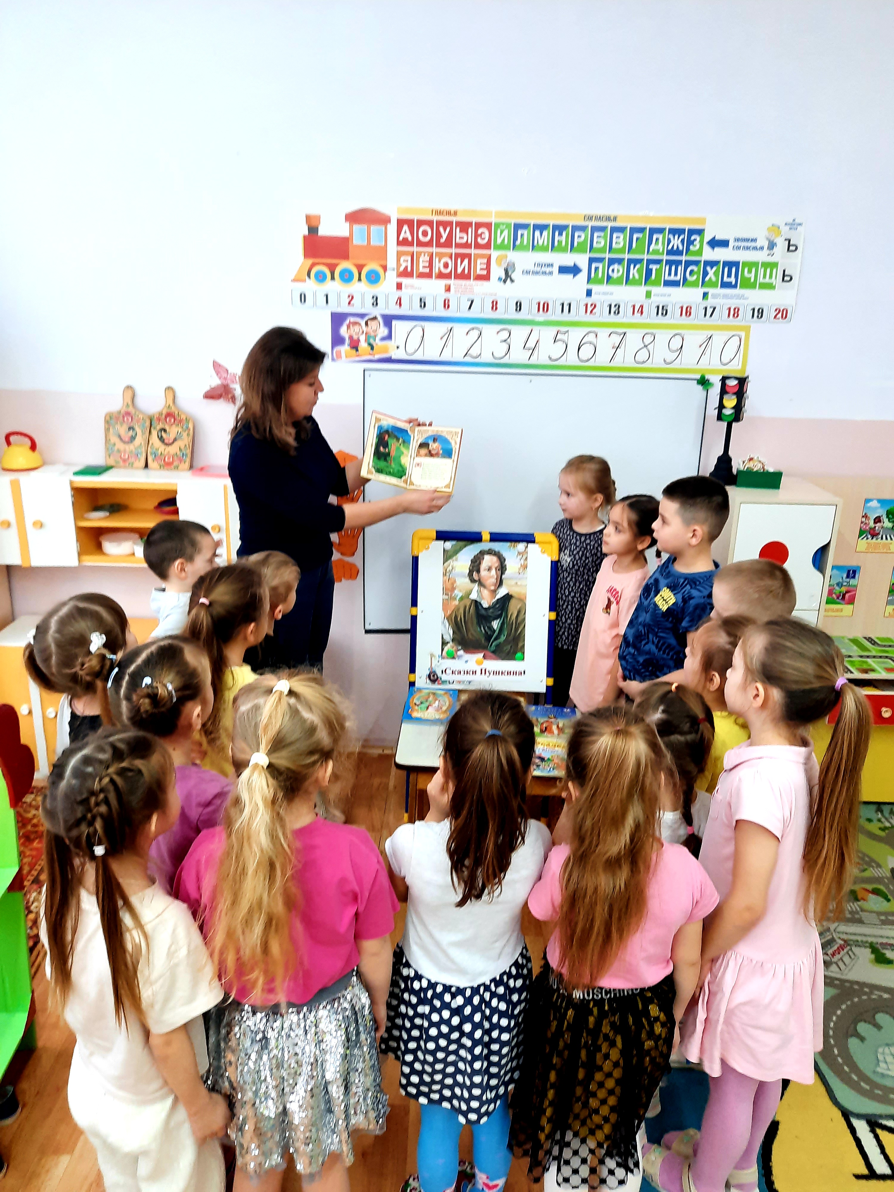 Өлкән яшьтәге балалар А.С. Пушкин биографиясе һәм иҗаты белән таныштылар, викторина сорауларына җавап биреп, яраткан әкиятләрен искә төшерделәр. Урта яшьтәге балалар "Балыкчы һәм балык турында әкият" мультфильмын карадылар һәм "Алтын балык" пластилиныннан аппликация башкардылар. Шулай ук төркемнәрдә укучылар А.С. Пушкин әсәрләре белән таныша һәм атаклы әкиятләрнең иллюстрацияләрен карый алган китаплар күргәзмәсе дә оештырылган.
