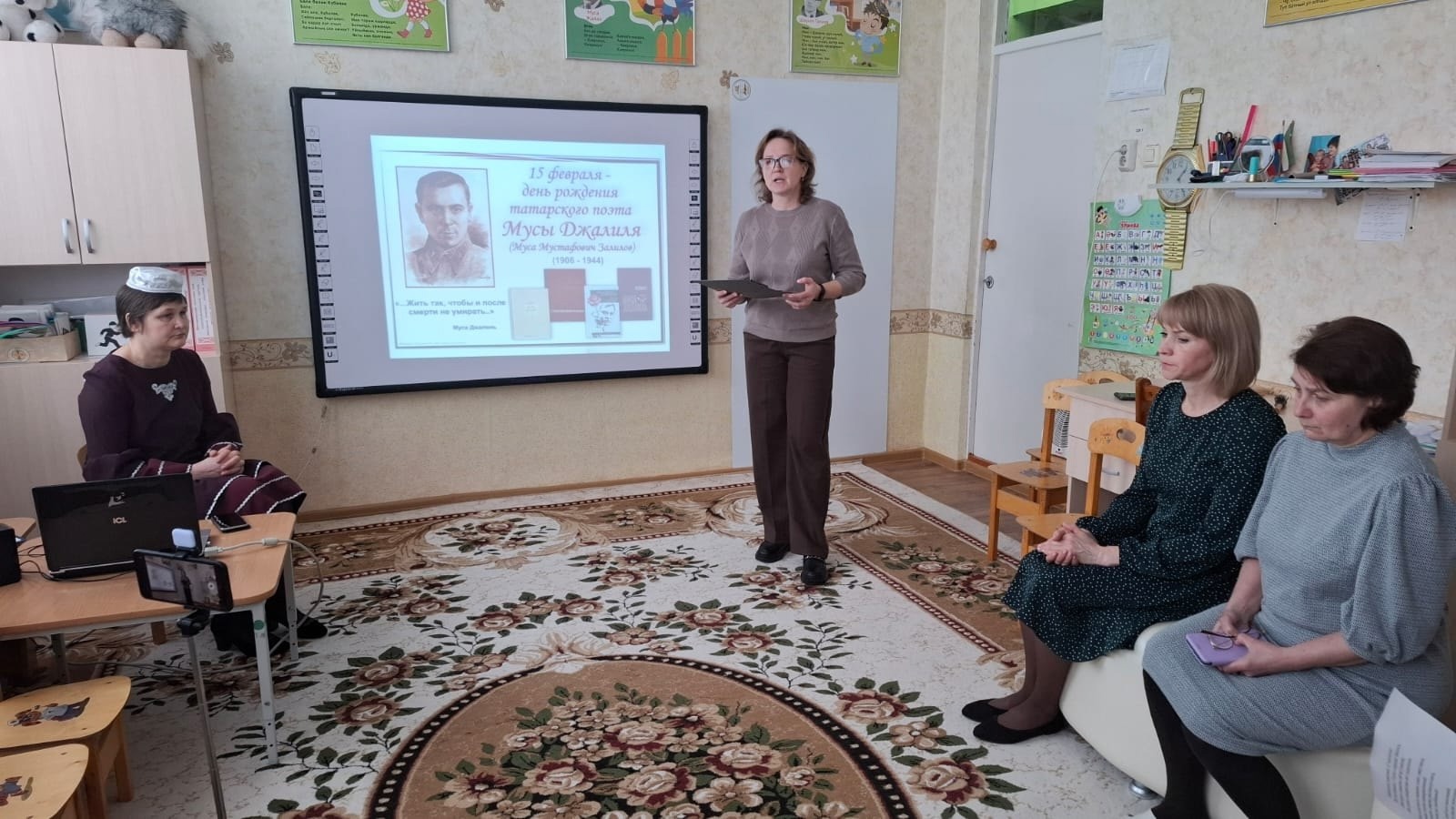 Татар теле тәрбияче Абдурахманова А.В. бу очрашуны «Ватан нәрсәдән башлана? "( “С чего начинается Родина?”) җыры белән башланды. Педагоглар Җәлилнең балачагы турындагы истәлекләр дөньясына чумдылар, аның биографиясеннән кызыклы фактлар белделәр,шулай ук шагыйрьнең якыннарына һәм Ватанга мәхәббәт, азатлыкка сусау һәм көрәшкә өндәү белән тулы шигырьләрен укыдылар. Чара «Хотят ли русские войны? " җырын башкару белән тәмамланды.