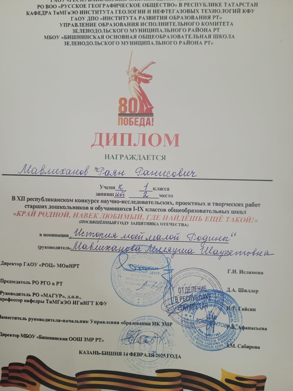 "П.С. Ханжин исемендәге 1 нче Тәтеш урта мәктәбе" нең 1 нче сыйныф укучысы Мавлиханов Раян "Гүзәл туган як, кайда шушындыйны табарсың" республика фәнни-гамәли конференциясендә катнашты һәм 2 нче дәрәҗә дипломант булды (остазы: М.Ш. Мавлиханова).