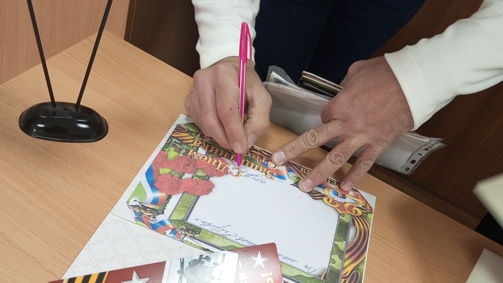 Татарстан Республикасы ЗАГС идарәсе инициативасы белән җибәрелгән “Безнең батырлар” акциясе кысаларында Тәтеш муниципаль районы Башкарма комитетының ЗАГС бүлегендә никахларын теркәгән Дарья һәм Валерий, Ватанны һәм якыннарын яклаучы хәрби хезмәткәрләр өчен котлау открыткасы имзаладылар.