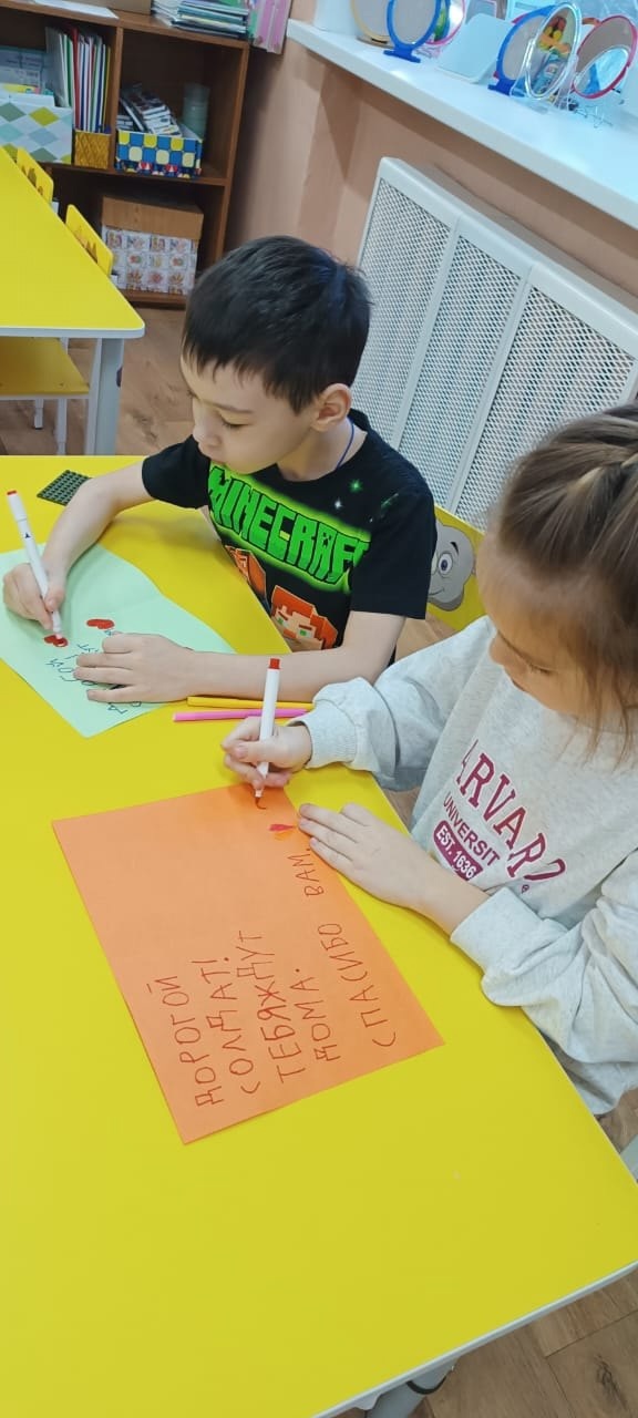 Балалар хәрби операция-авыр эш, анда солдат һәр сәгать саен үз гомерен куркыныч астына куюын беләләр. Сугышчыга ял минутларында хат рәвешендә яхшы хәбәр алу шундый күңелле! Хатның кемнән булуы мөһим түгел, бары хәбәрнең яхшы булуы күпкә мөһимрәк. Үзләренең хатларындагы рәсемнәре белән балалар сугышчыларга ихлас рәхмәтләрен белдерделәр, кешеләрнең хокукларын һәм ирекләрен яклап, алгы сызыкта торган солдатларга ярдәм сүзләрен әйттеләр.