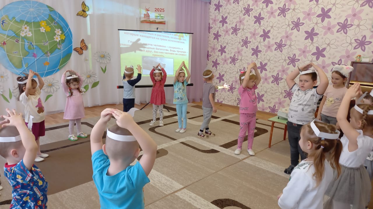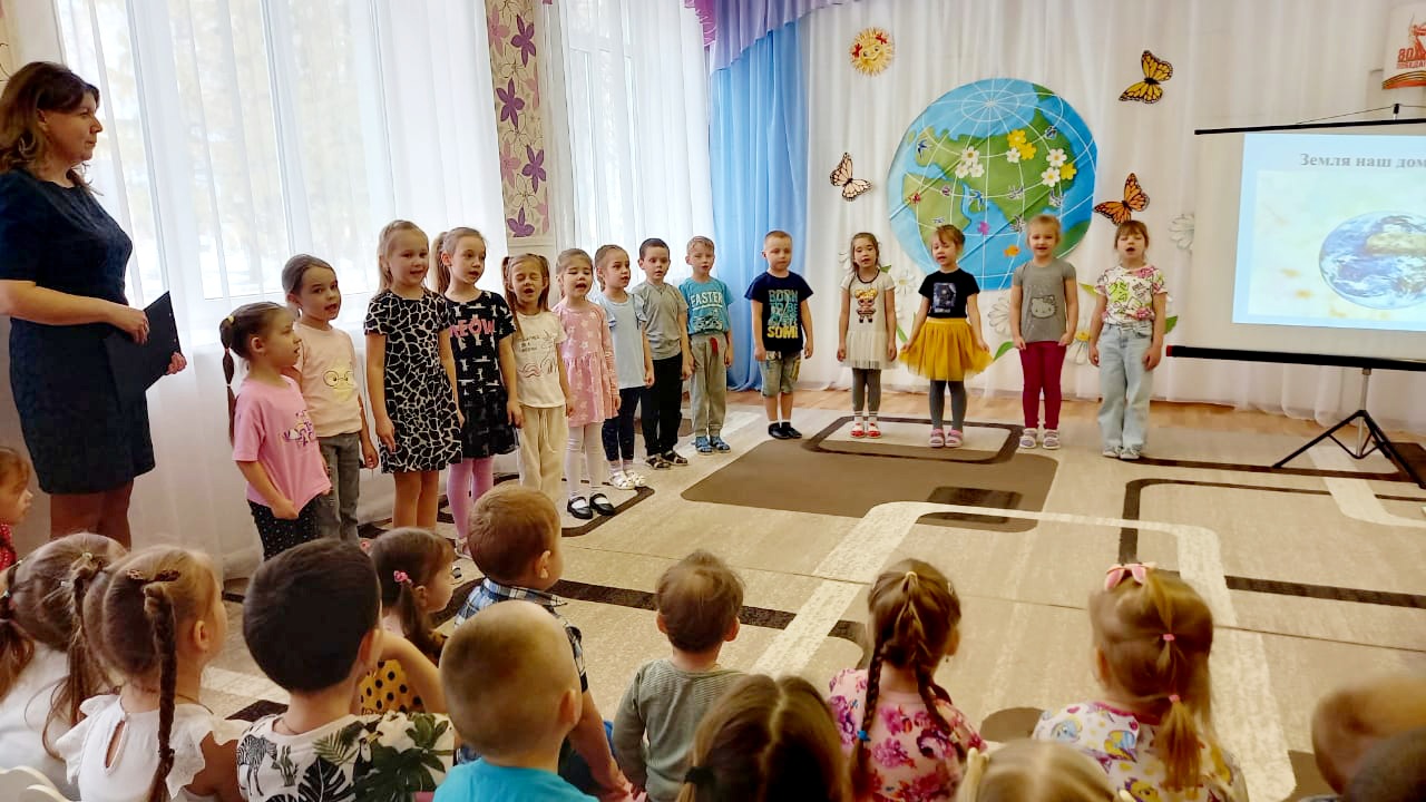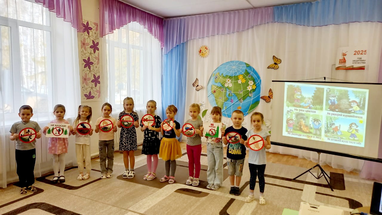 Балалар «Җир – безнең уртак йортыбыз» дигән презентацияне карадылар. Балалар барлык тереклекнең ни өчен һәлак булуын һәм кешеләрнең җирнең матурлыгын саклап калырга ничек ярдәм итә алуын белделәр. Балалар белән бергә «Табигатьтә үз-үзеңне тоту кагыйдәләрен» искә төшерделәр, глобусны карадылар, «Җирнең киләчәге безнең кулларда» һәм «Безнең планетаны саклагыз!».