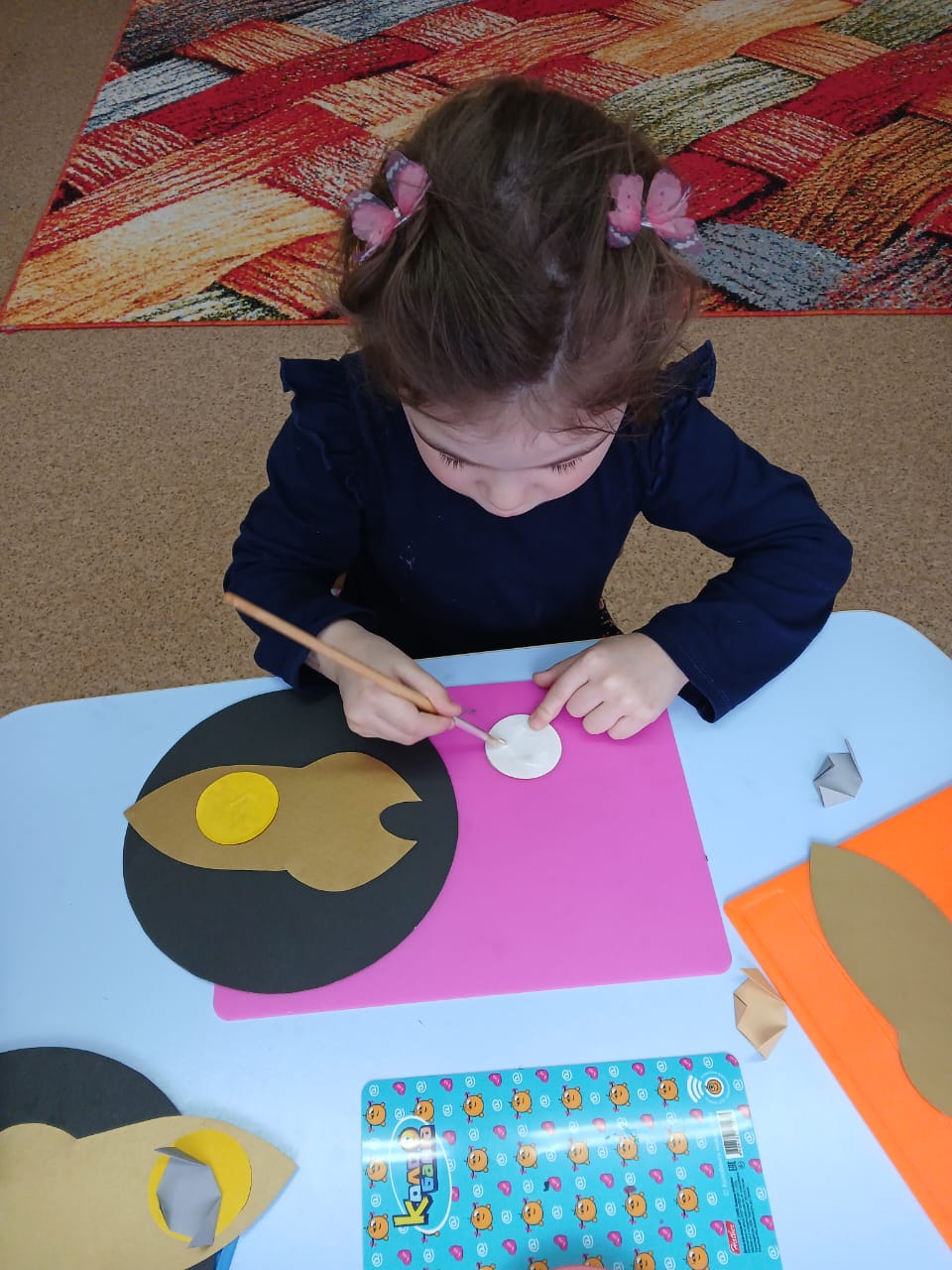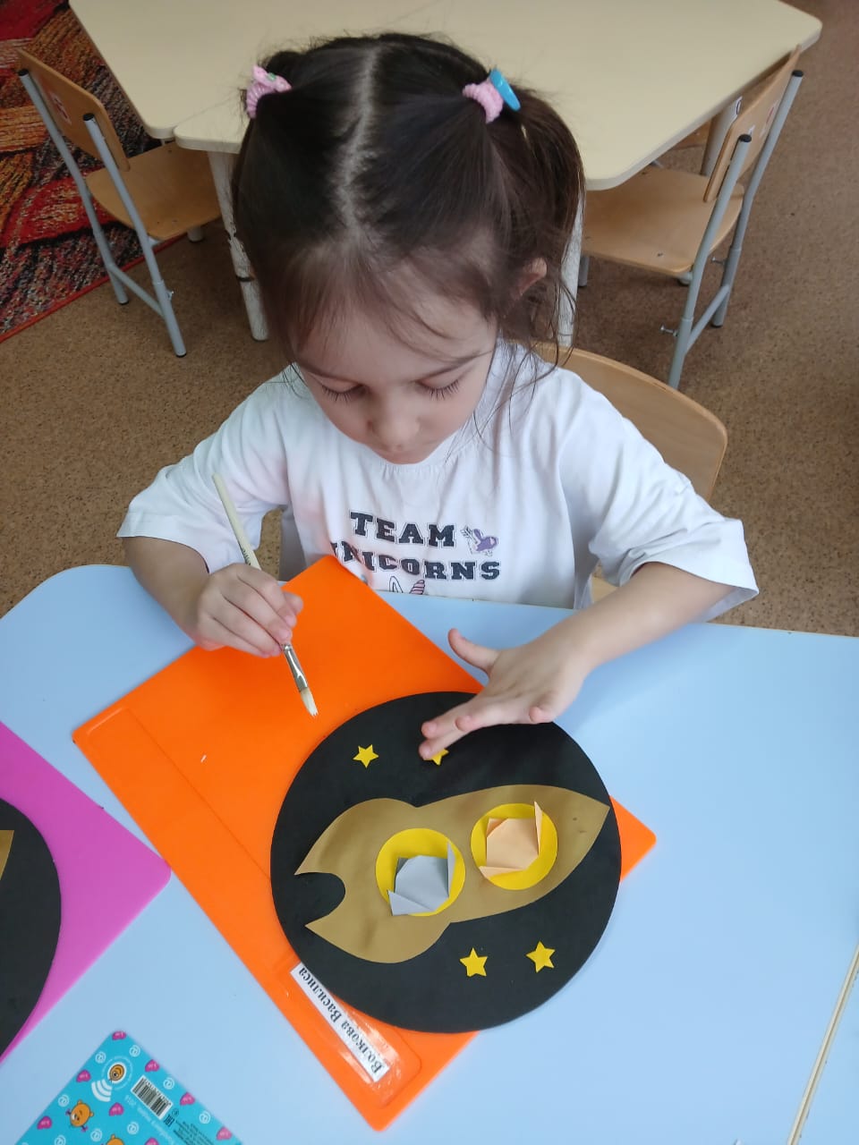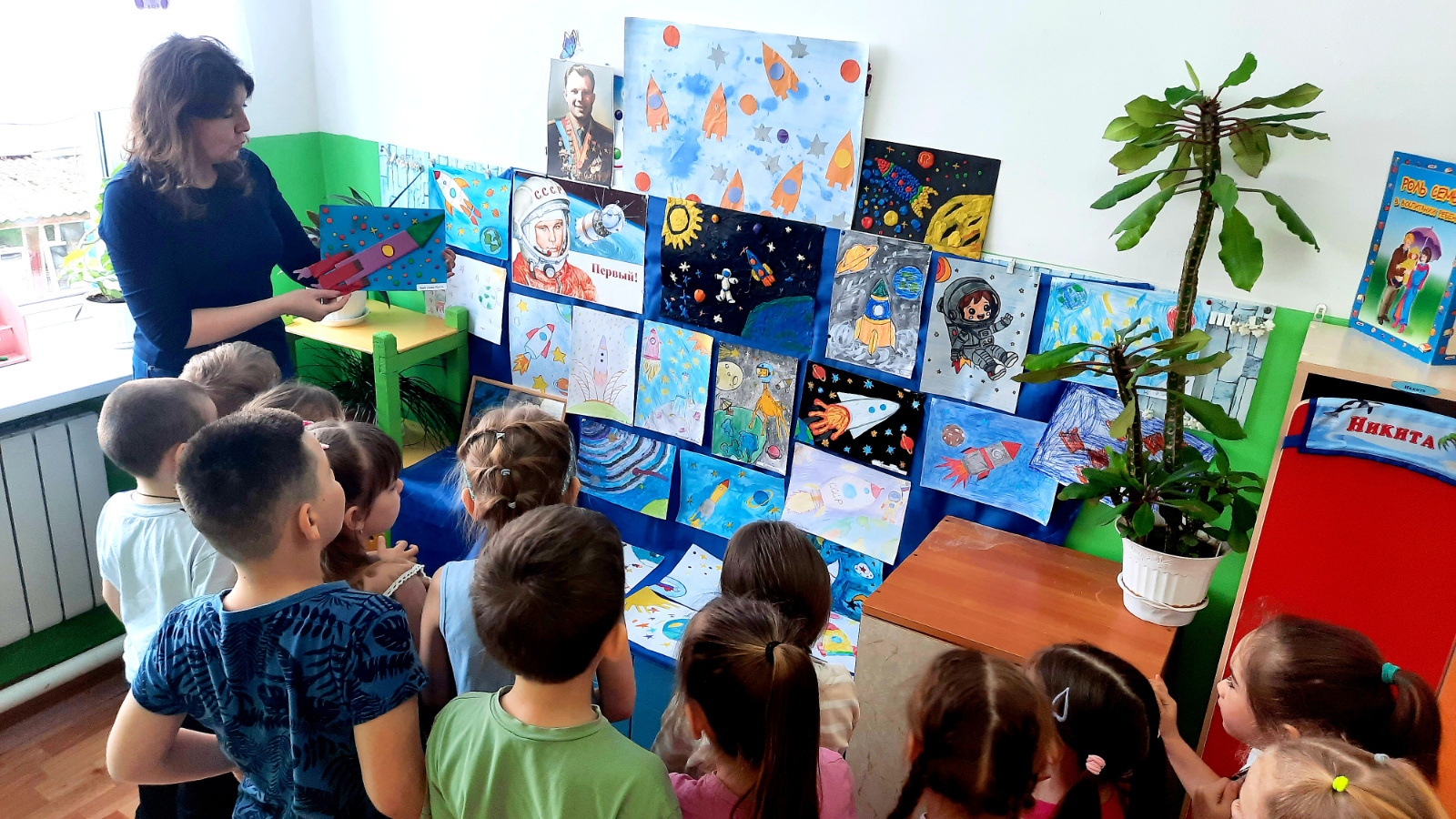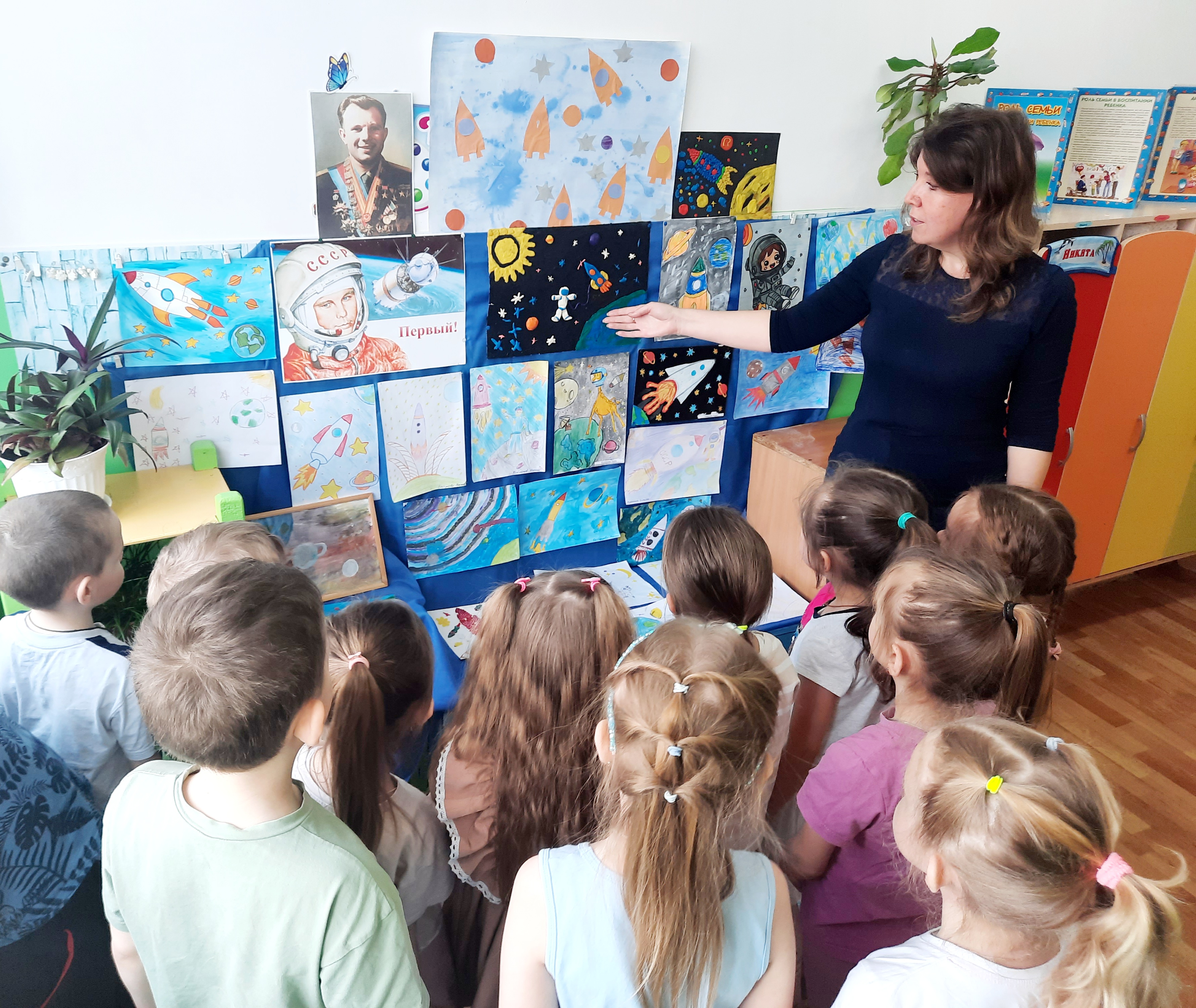 Балалар космосны үзләштерү тарихы, кешенең космоска беренче тапкыр очуы турында таныштылар, космонавтика белән бәйле күп кенә яңа һөнәрләр белделәр, Юрий Гагарин һәм космосны яулаган башка геройлар турында хикәяләр тыңладылар. Дәрес барышында өлкән-әзерлек төркеме балалары яңа мәгълүмат алып кына калмадылар, ә зур рәхәтлек белән геометрик фигуралардан ракеталар җыйдылар һәм космоска беренче очыш турында видеофильм карадылар. Кечкенә яшьтәге балалар педагог белән бергә "Космоста" дигән эшне башкардылар. Урта группа балалары ракета аппликацияләрен башкардылар.