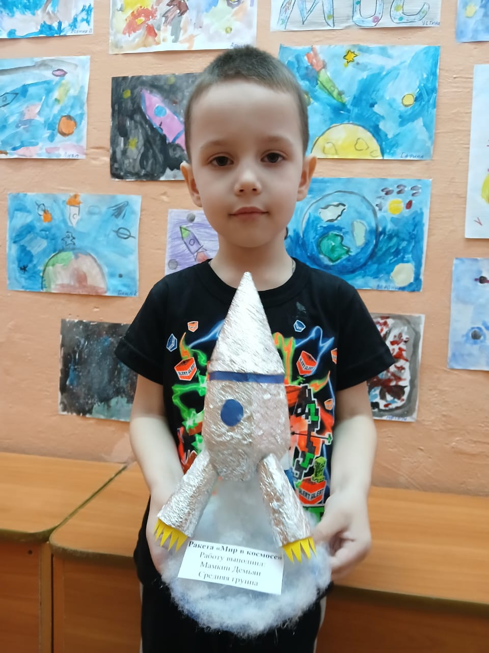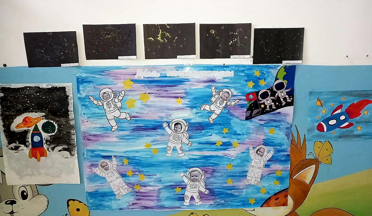 Барлык төркемнәрдә дә балалар әти-әниләре белән бергә әзерләгән космик рәсемнәр һәм эшләнмәләрнең тематик күргәзмәләре бизәлгән. Эшләр оригиналь һәм төсле килеп чыкты.