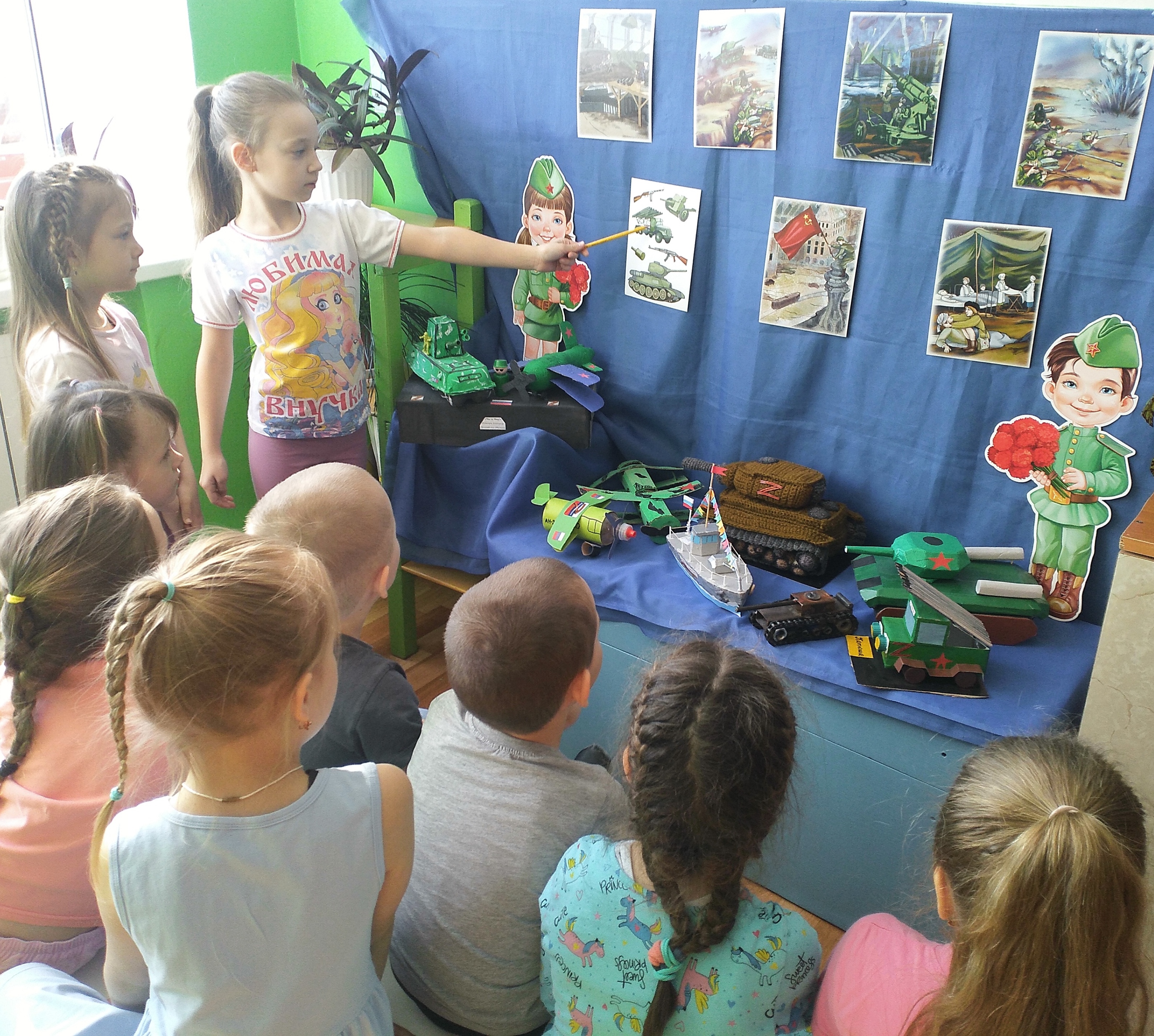 Балалар сугышчан машиналарны, танкларны, самолетларны, корабларны кызыксынып карыйлар. Укытучылар балаларга сугыш, Армиябезнең батырлыклары турында сөйлиләр.